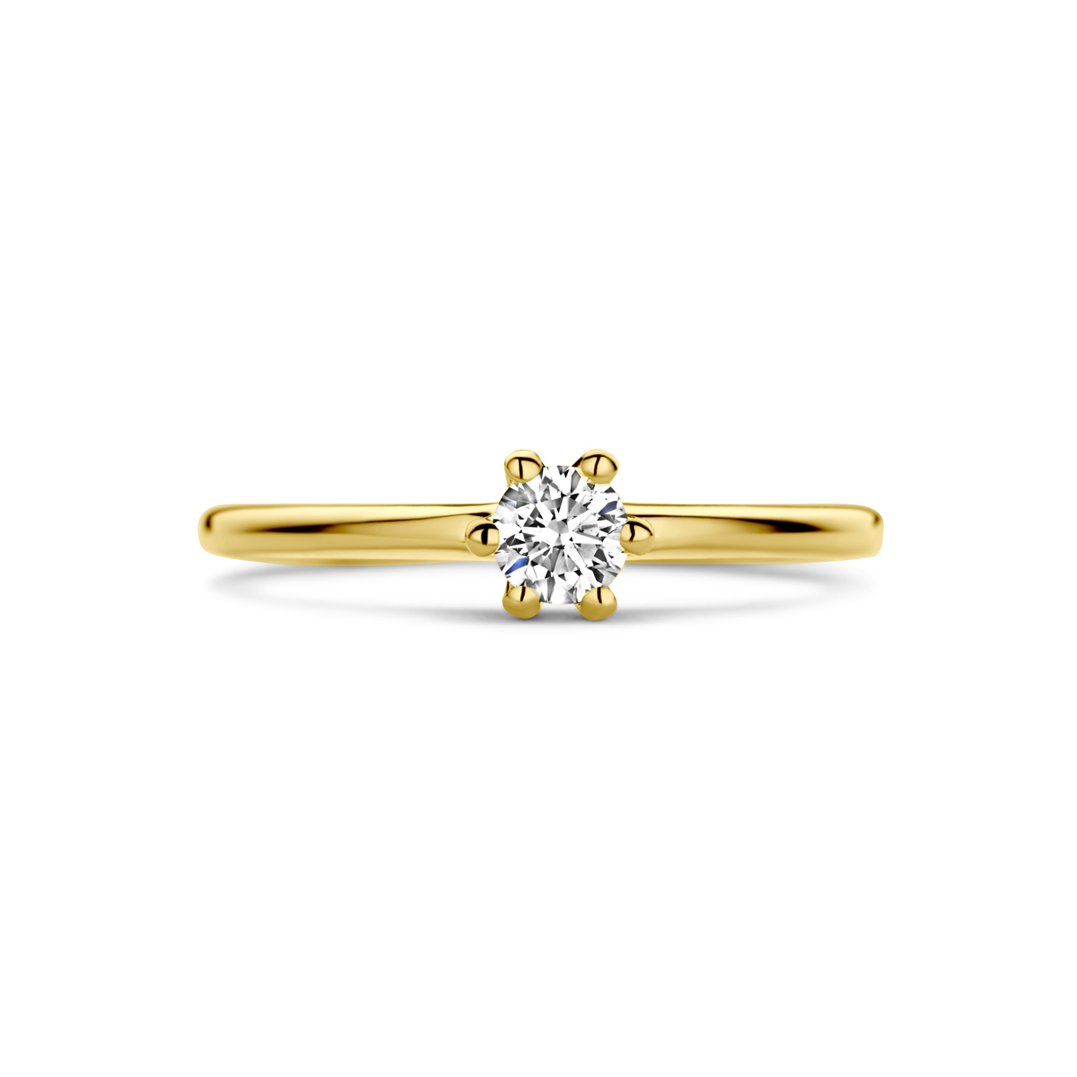 14k Geelgouden ring uitgevoerd met diamant. De ring heeft een breedte van 4,2mm.