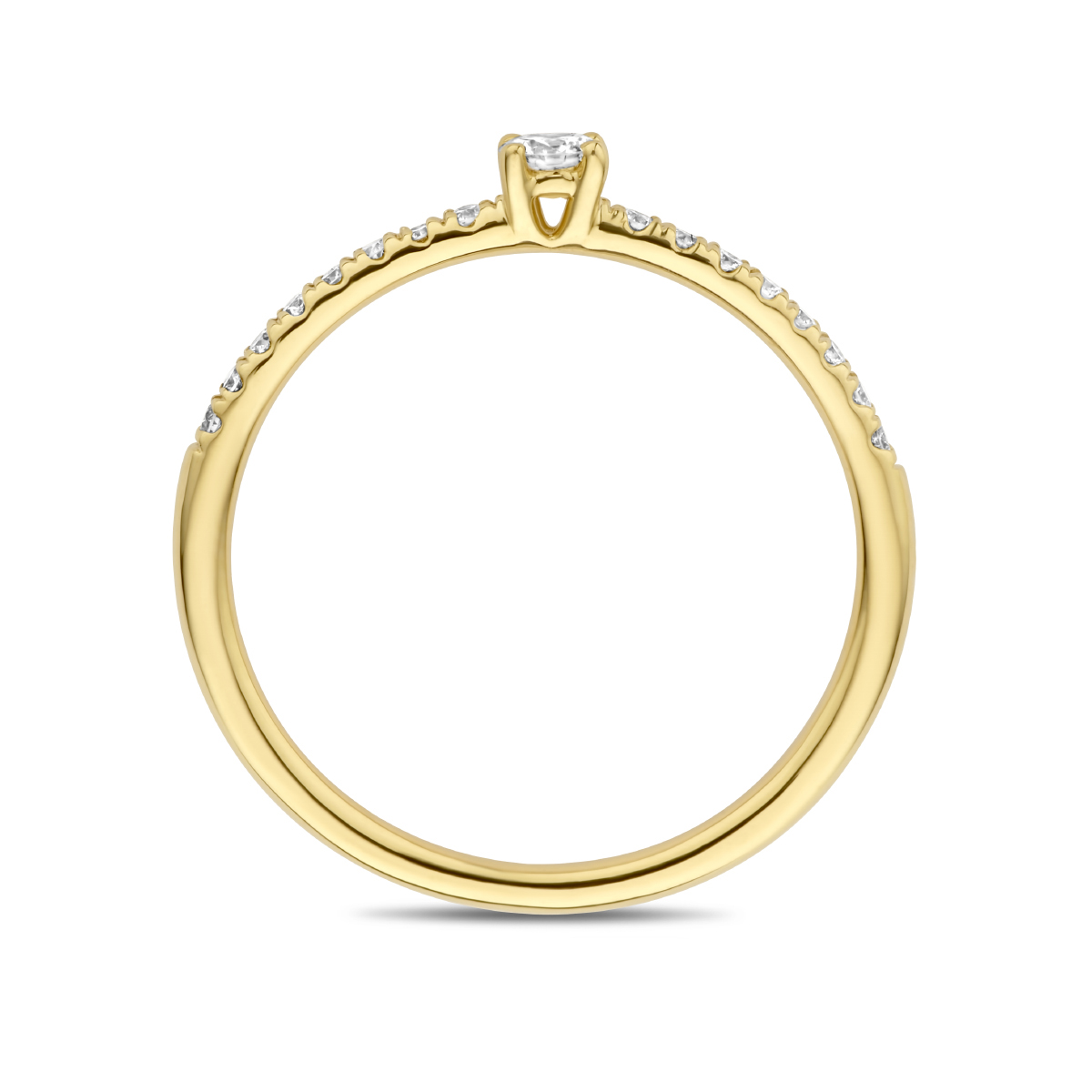 14k Geelgouden ring uitgevoerd met schitterende diamanten. De ring heeft een breedte van 3mm en het diamantgewicht is 0.25ct.