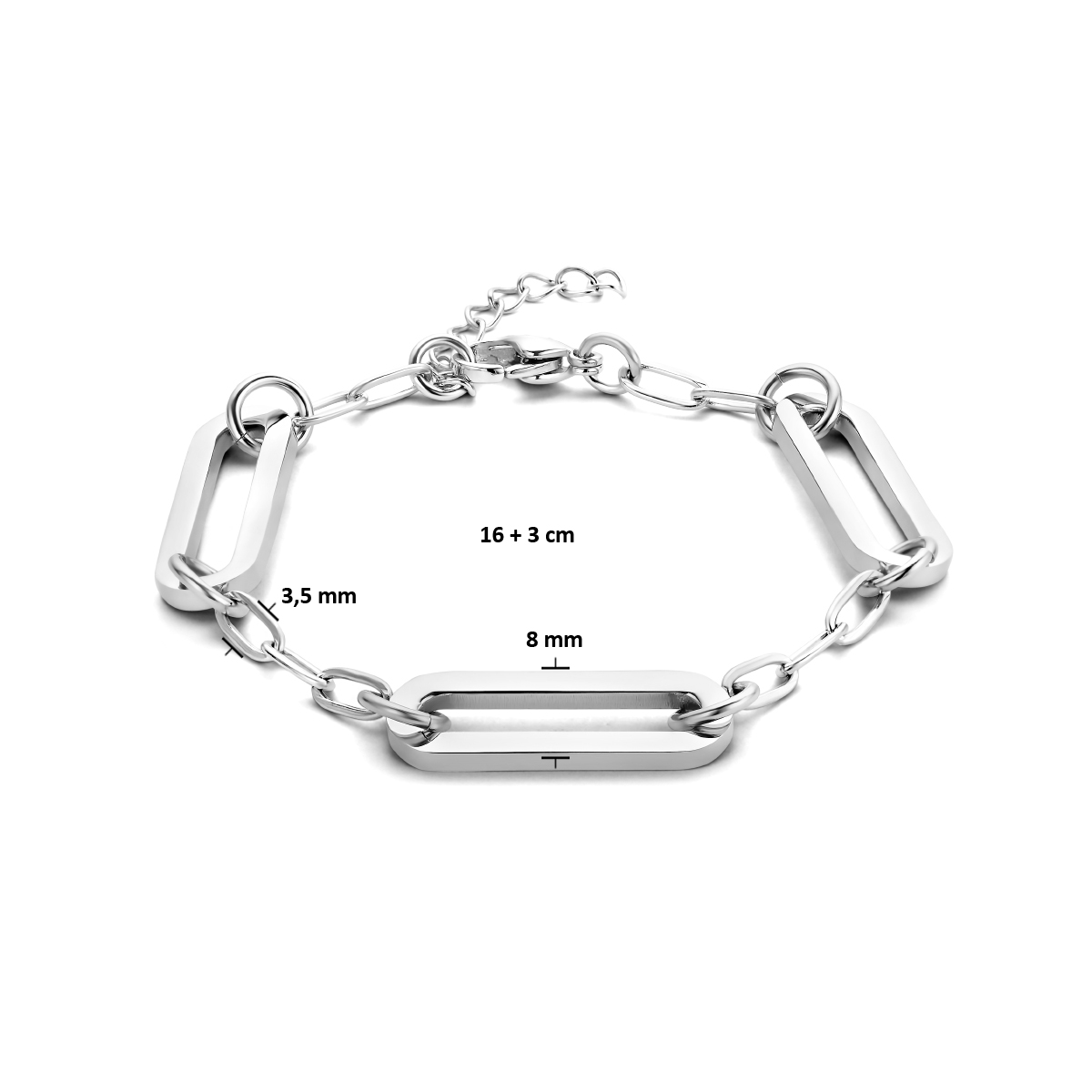 Stalen paperclip armband met schakelbreedtes van 3.5 en 8mm. De armband heeft een draaglengte van 16cm met een extensie van 3cm en karabijn sluiting.