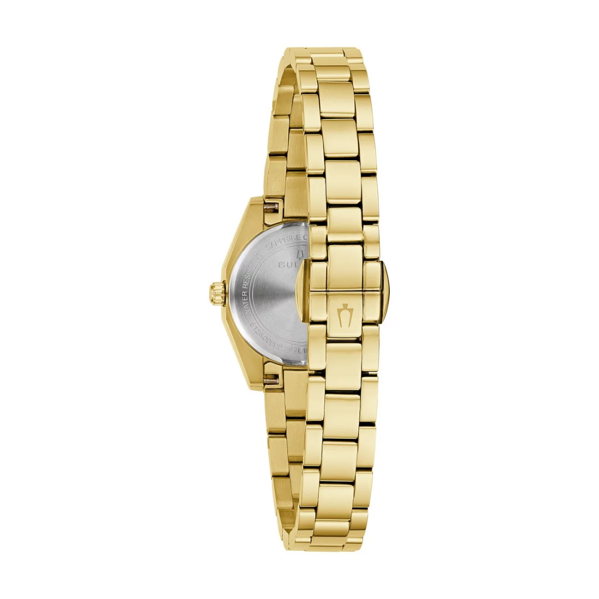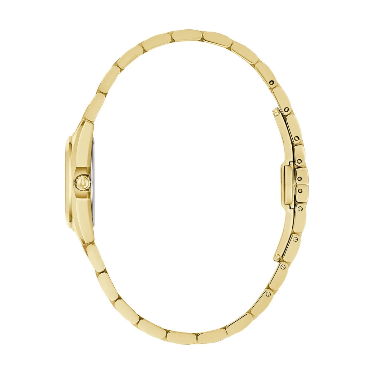 De Bulova Dameshorloge 97L187 heeft een ronde kast van roestvrij staal met een goudkleurige afwerking. Het heeft een analoge wijzerplaat in het roze met streepjesindex en saffierglas. Het horloge is niet allergievrij, heeft een quartz uurwerk, is waterbestendig tot 3 atm en is nikkelvrij. Draag het elegant bij formele of alledaagse outfits.