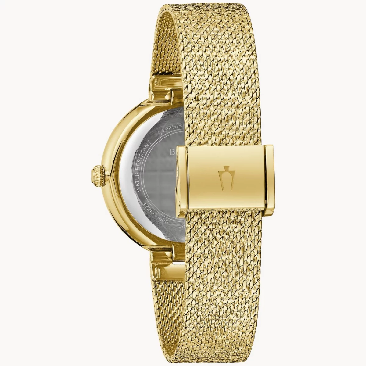 De Bulova dameshorloge model 98L321 is elegant en verfijnd. Kenmerken zijn een goudkleurige ronde roestvrijstalen kast met saffierglas, sierdiamanten op de wijzerplaat en een Milanese mesh band. Waterbestendig tot 3 ATM en aangedreven door een quartz uurwerk. Perfect te dragen bij formele gelegenheden of als stijlvolle toevoeging aan je dagelijkse outfit.