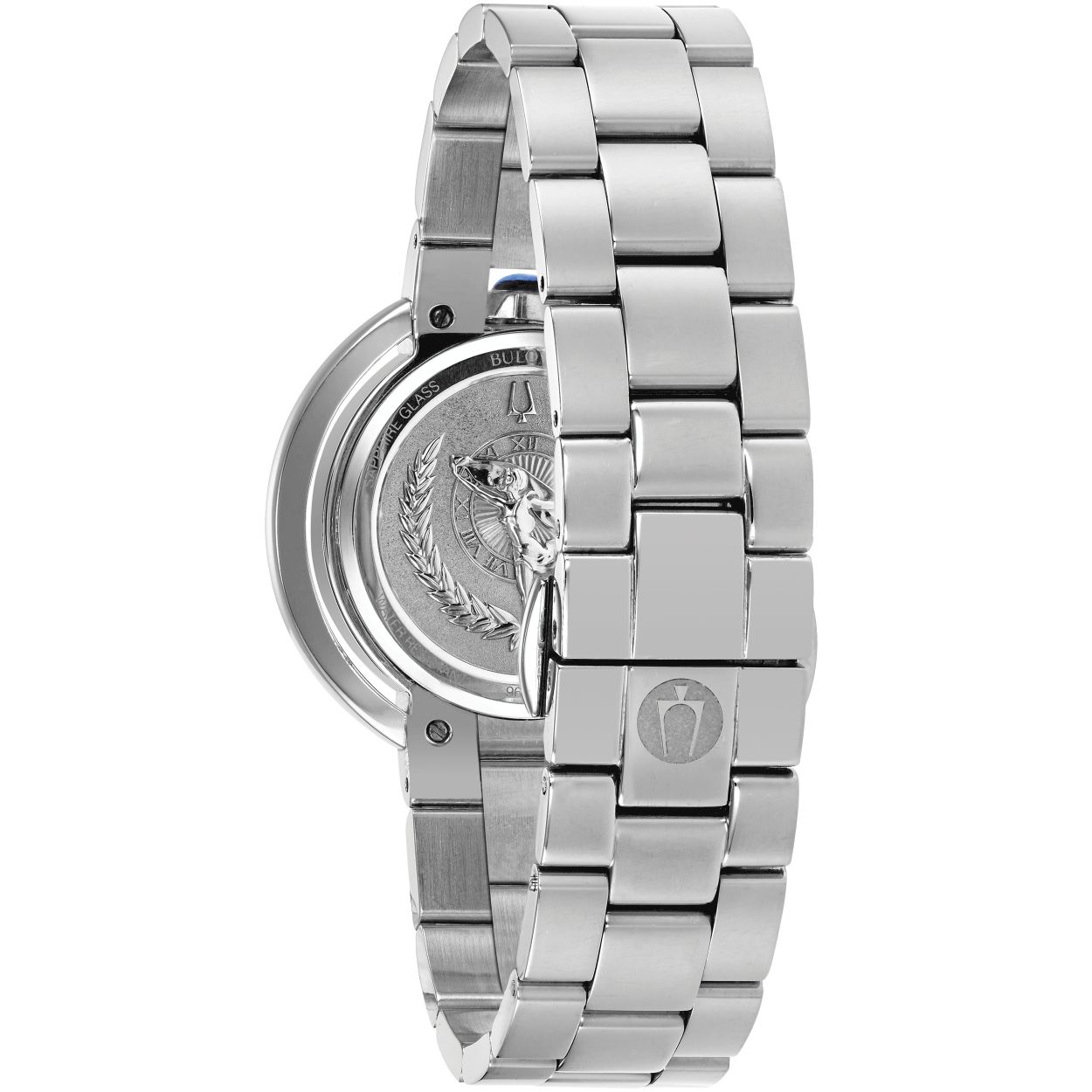 Dit is een stijlvol horloge van Bulova met prachtige diamanten in de wijzerplaat en een blauwe cabochon op de kroon. Het horloge is voorzien van saffierglas dat krasbestendig is. Dit model is ontworpen voor dames.