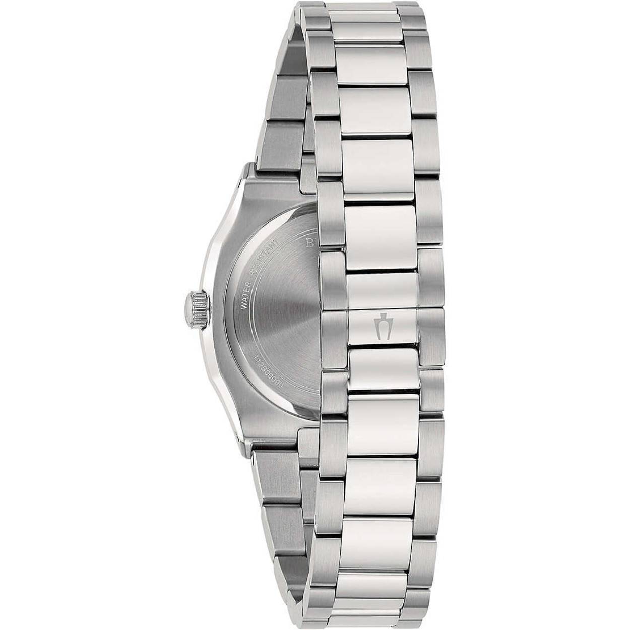Bulova Surveyor Diamonds women's watch 96R246 steel with diamonds. Watch with steel case with a diameter of 31 mm with a glossy silver finish. Bezel embellished with 22 diamonds. Blue mother-of-pearl dial, mineral glass and date window at 6 o'clock. Quartz time only movement. Silver-colored steel bracelet with Deployant clasp. Watch with 5 atm water resistance, delivered with original box and official guarantee. wedding watches
