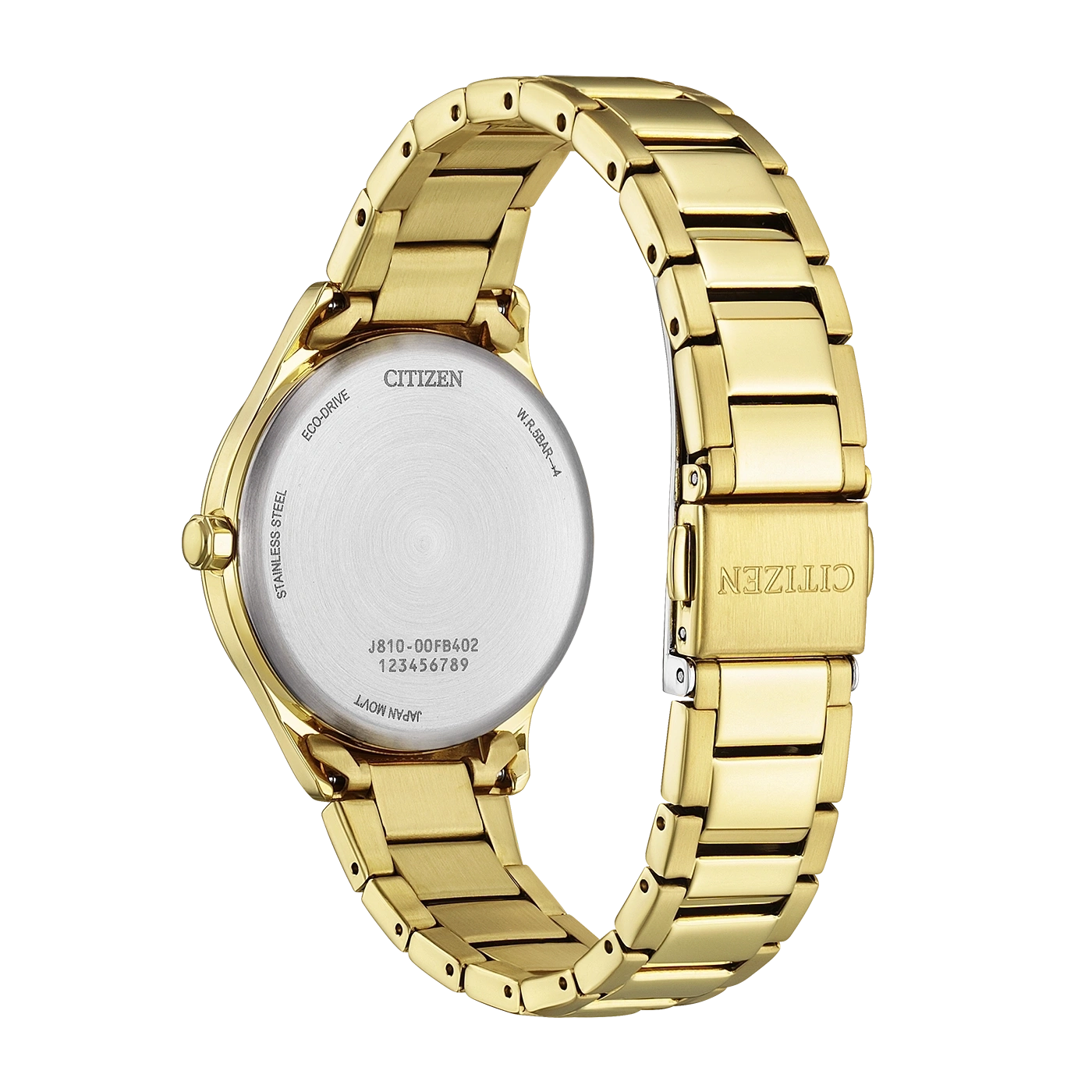 De Citizen FE6122‑64A is een elegant dameshorloge uit de Elegance / Citizen OF Collection met een compacte **roestvrijstalen kast van ca. 33,5 mm en een bijpassende goudkleurige metalen schakelband. Het horloge werkt op Citizen Eco‑Drive technologie, wat betekent dat het wordt aangedreven door licht en geen batterijwissel nodig heeft. De witte wijzerplaat heeft een analoge tijdsweergave met een duidelijk datumvenster op 3 uur. Het mineraalglas beschermt de wijzerplaat en de waterdichtheid van 5 bar / 50 m is geschikt voor dagelijks gebruik, zoals douchen of regen — ideaal voor dagelijks dragen met een verfijnde uitstraling