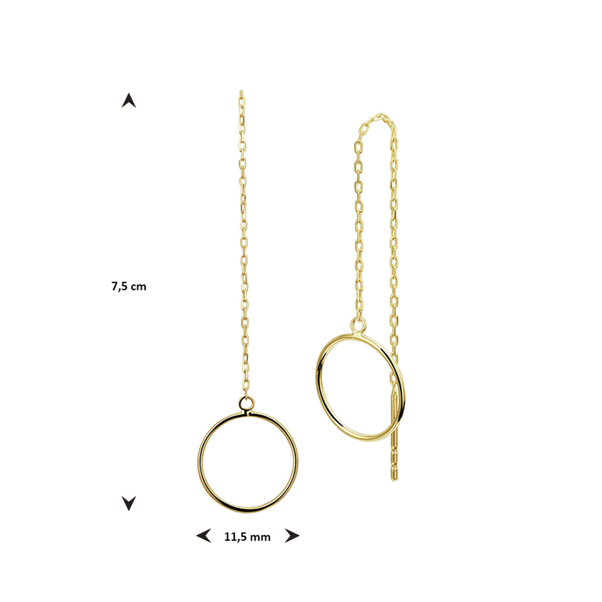 Trendy geelgouden doortrekoorbellen met een hoogte van 7.5cm en een door een anker schakel verbonden rondje van 11.4mm. De oorsieraden zijn te combineren met bijpassende sieraden uit onze collectie.