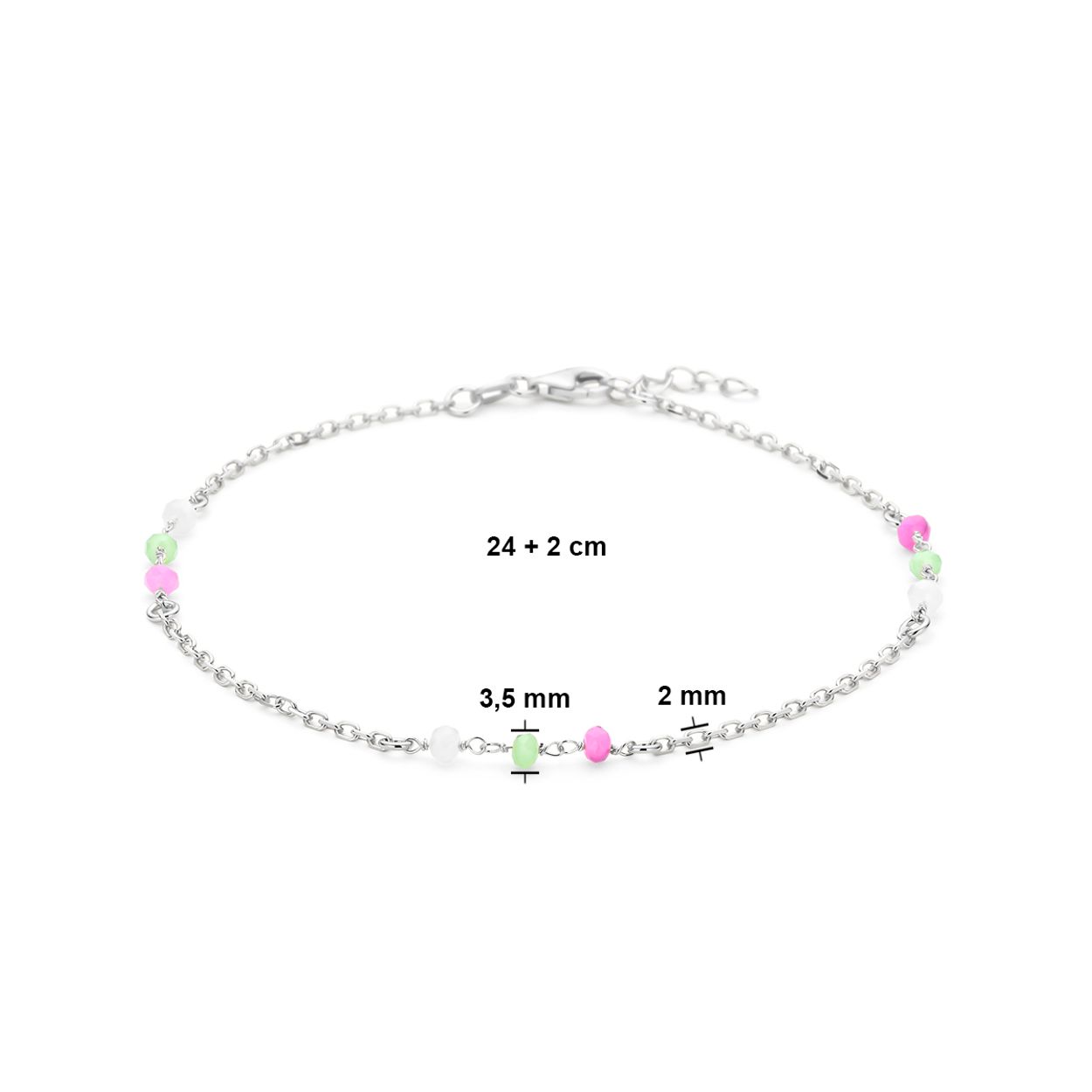 Gerhodineerd 925 zilveren enkelbandje uitgevoerd met wit, groen en roze kristal bolletjes. Het enkelbandje heeft een draaglengte van 24 en een extensie van 2cm. Uitgevoerd met een karabijn sluiting.
