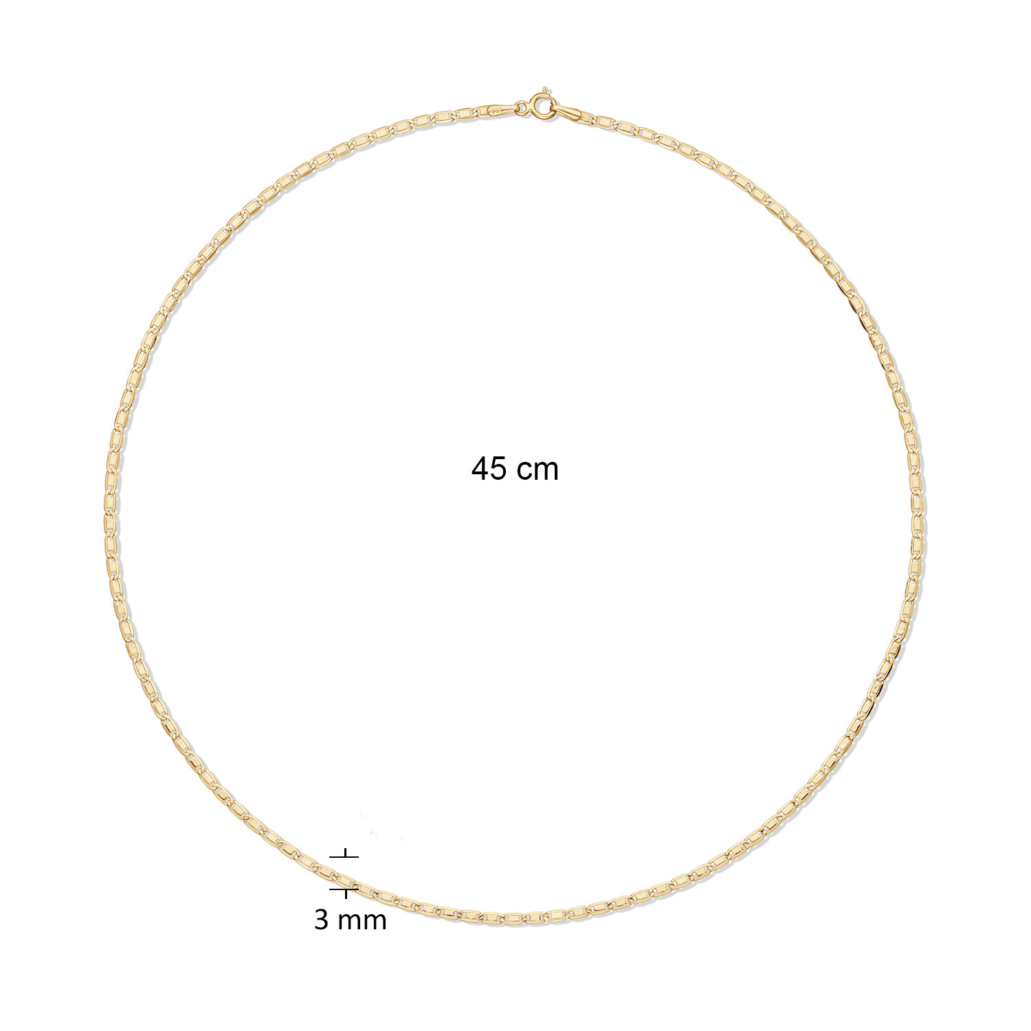 Dit exclusieve gouden collie is een stijlvolle halsketting met een diepte van 1,0 en een breedte van 3,0. Draag deze ketting als een verfijnd statement bij een elegante jurk of een chique blouse voor een luxueuze uitstraling.