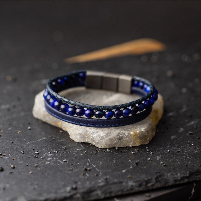 De Triple Blue armband wordt gemaakt met echt Italiaans nappaleer en elegante 6mm Tijgeroog natuursteen, afkomstig uit Zuid-Afrika.