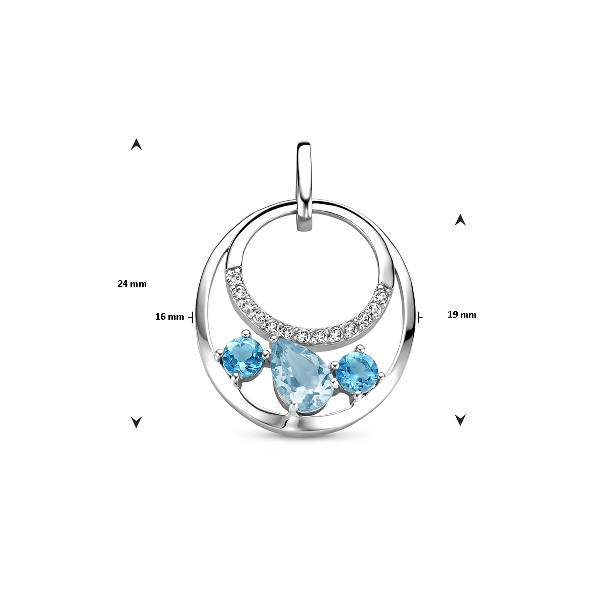 Gerhodineerd 925 zilveren hanger uitgevoerd met blauw en wit topaas. De hanger heeft een  totale hoogte van 24mm.