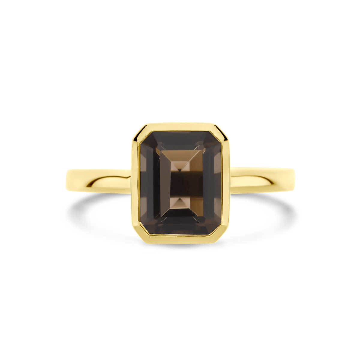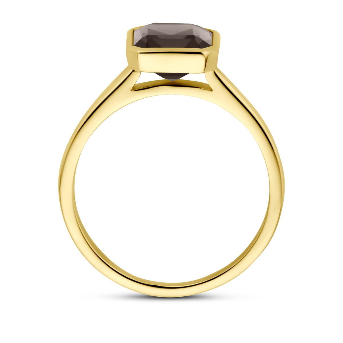14k Geelgouden ring uitgevoerd met rookkwarts. De ring heeft een breedte van 10mm.