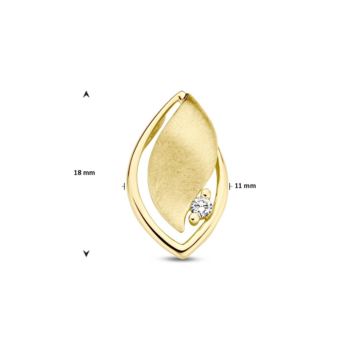 14k Geelgouden hanger uitgevoerd met diamant. De hanger heeft een afmeting van 18x11mm.
