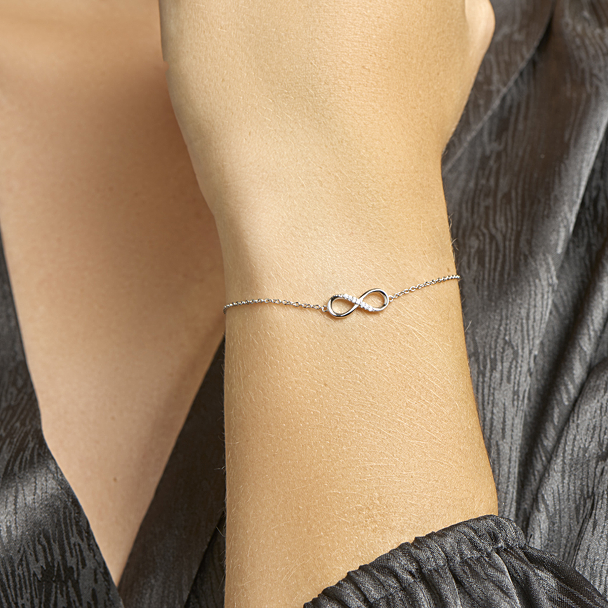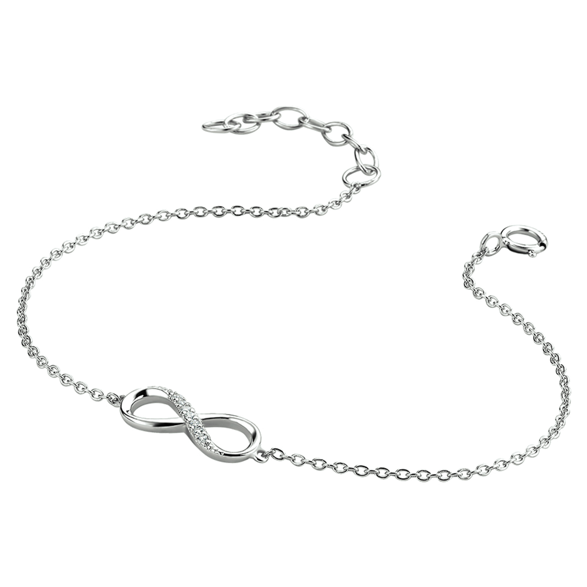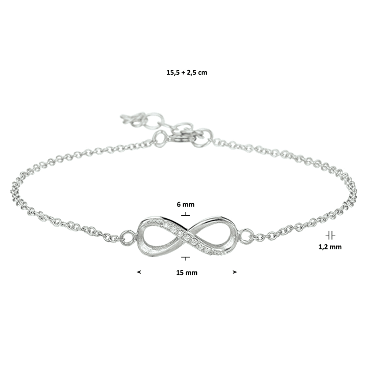 Gerhodineerd zilveren armband met infinity teken en zirkonia. De armband is onderdeel van een set. De lengte van de armband bedraagt 15.5cm met 2.5cm extensie. De schakelbreedte bedraagt 1.2mm.