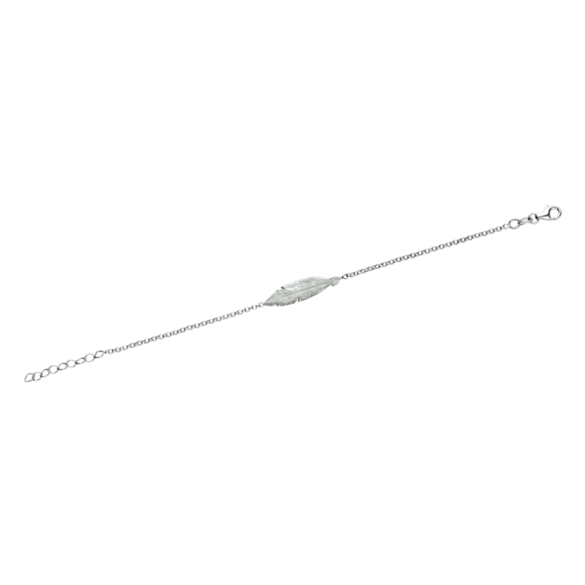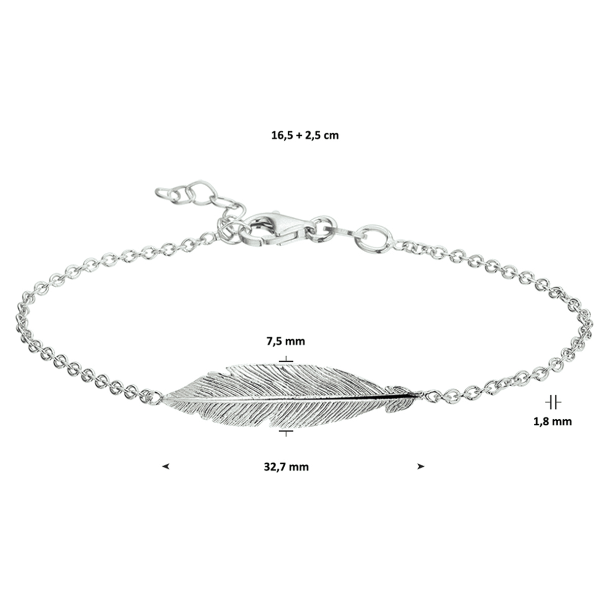 Gerhodineerd 925 zilveren armband uitgevoerd met een veer. De armband heeft een draaglengte van 16.5cm met 2.5cm extensie en een schakelbreedte van 1.8mm. Uitgevoerd met een karabijn sluiting.