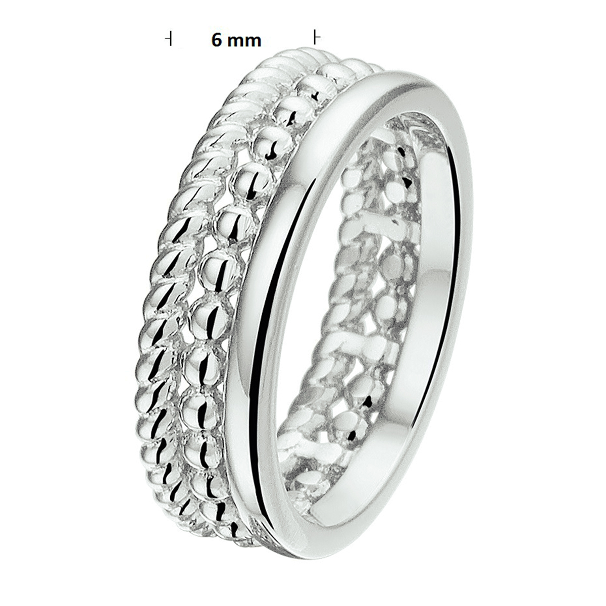 Trendy gerhodineerd zilveren ring van 6mm breed uitgevoerd met 3 verschillende soorten schenen hierdoor lijkt het alsof er 3 ringen om zitten. Ben je helemaal van het hier en nu hou je van sieraden van deze tijd?. Dan mag deze ring niet missen in jou sieraden stash!.