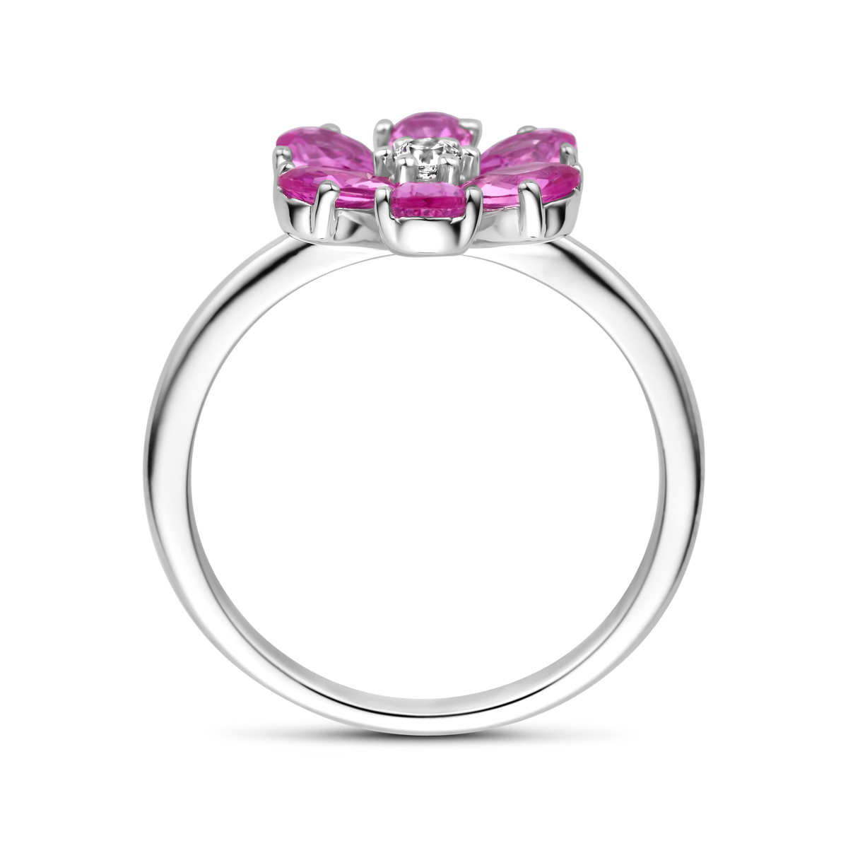 Gerhodineerd 925 zilveren ring uitgevoerd met wit en roze zirkonia. De ring heeft een breedte van 12mm.