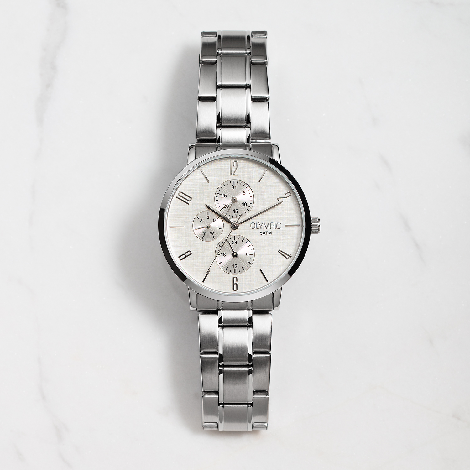 Olympic heren horloge met een stalen band en een witte wijzerplaat.