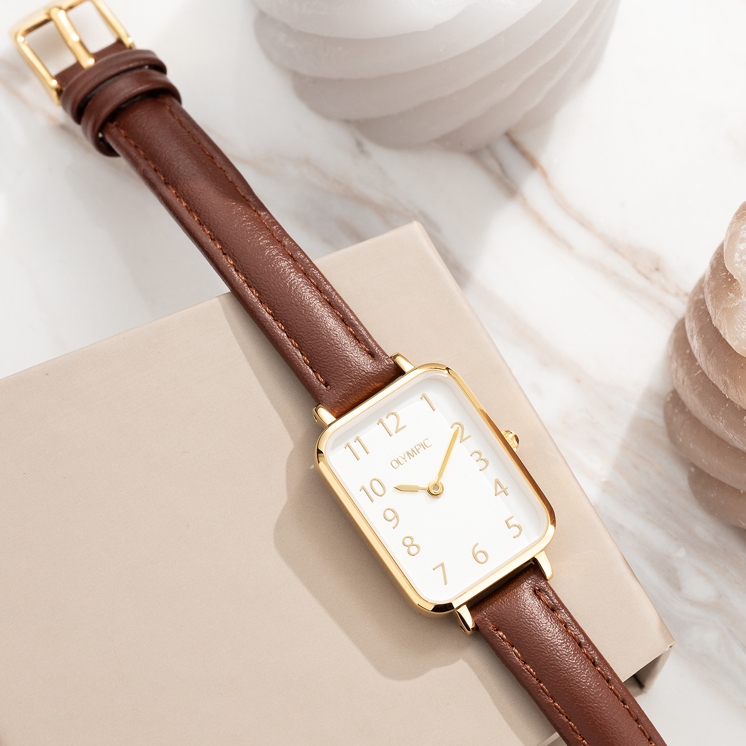 Dit Olympic dameshorloge (modelnummer OL66DDL008) heeft een analoge wijzerplaat met Arabische cijfers, een goudkleurige roestvrijstalen kast in rechthoekige vorm en witte wijzerplaat. Voorzien van een bruine lederen band. Quartz uurwerk, mineraal glas, waterbestendig tot niveau 3 en anti-allergisch. Perfect te dragen als dagelijks stijlvol accessoire bij elegante gelegenheden.