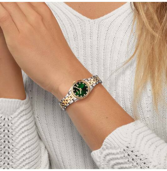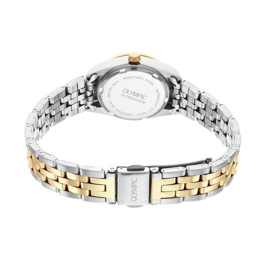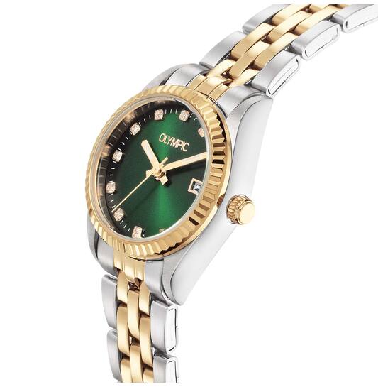 Olympic Dameshorloge OL75DSD002B is een elegant horloge met een roestvrijstalen kast en band in goud-zilverkleur. Het groene analoge wijzerplaat met strepen is versierd met sierdiamanten. Het heeft een mineraalglas, een datumaanduiding en is tot 5 ATM waterdicht. Perfect voor dagelijks gebruik of speciale gelegenheden. Draag het om je pols voor een stijlvolle uitstraling.