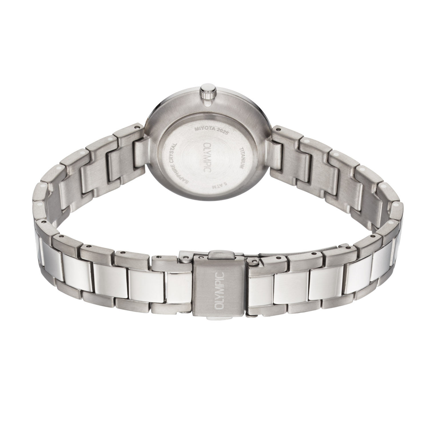 De Olympic Dameshorloge met modelnummer OL80DTT002 beschikt over de volgende kenmerken: analoge tijdsaanduiding, een grijze titanium kast en band, blauwe wijzerplaat, saffierglas, quartz uurwerk en een rond design. De horloge is spatwaterdicht tot 5 ATM. Draag deze elegante horloge bij zowel casual als zakelijke outfits voor een stijlvolle en moderne uitstraling.