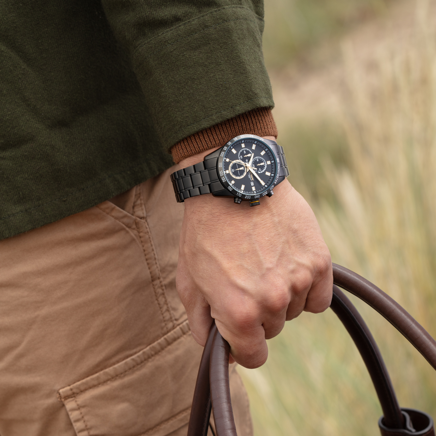 Grijze chronograaf met zwarte wijzerplaat, goudkleurige wijzers en datumaanduiding. 3 jaar garantie op het uurwerk!