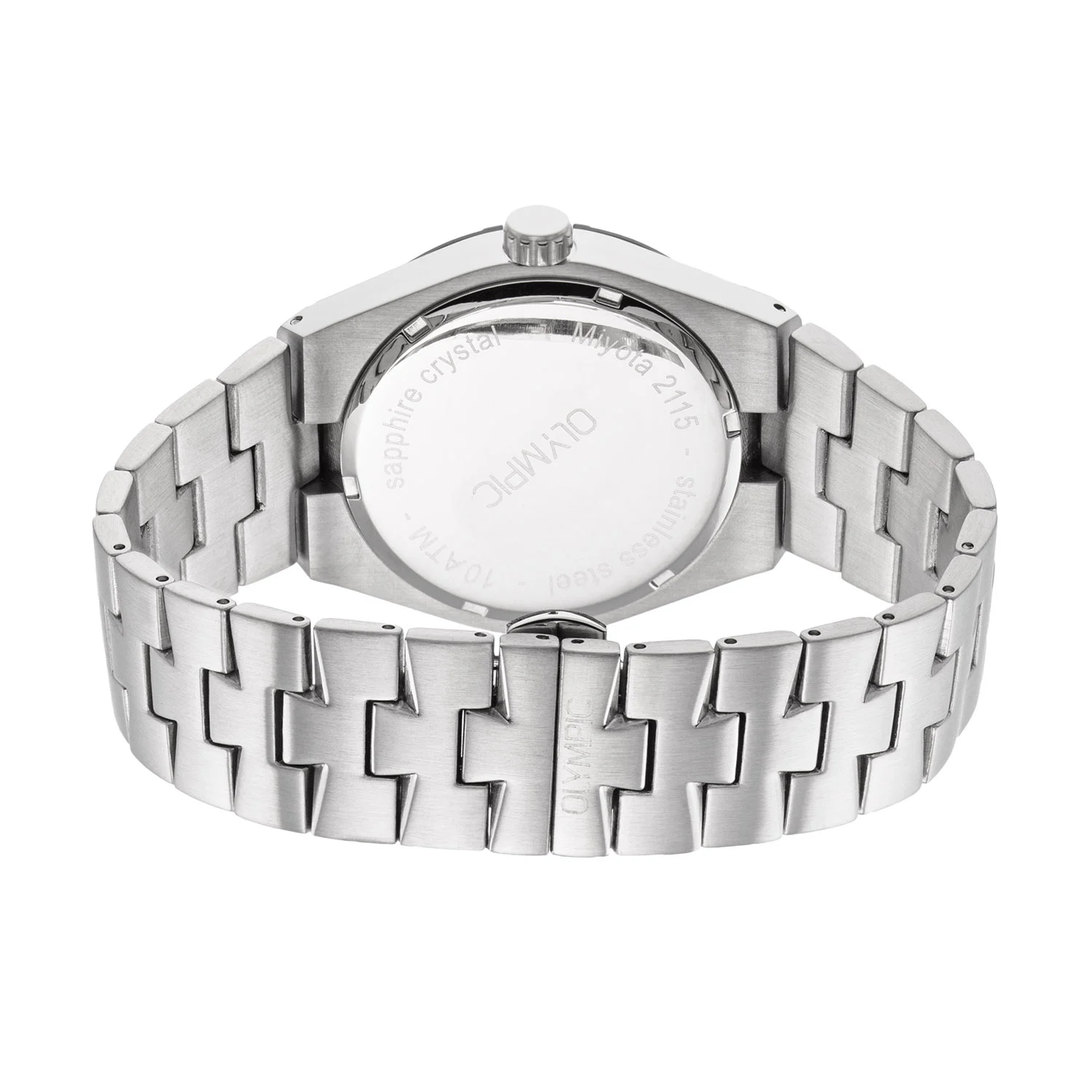 Olympic herenhorloge, modelnummer OL75HSS005, heeft een zilverkleurige metalen kast en band, een blauwe wijzerplaat met een strepenpatroon, en saffierglas. Het horloge is waterdicht tot 10 ATM en heeft een datumfunctie. Het functioneert op een quartz uurwerk. Draag het bij formele of casual outfits voor een stijlvolle look.