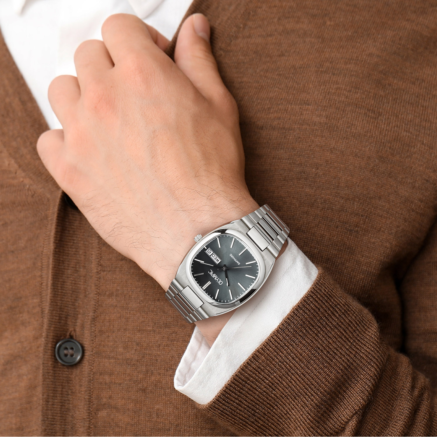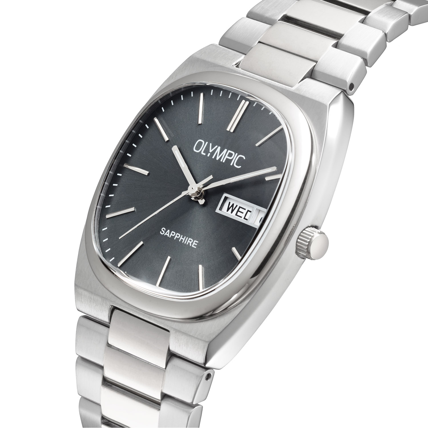 Het Olympic Herenhorloge biedt een stijlvolle combinatie van functies: een analoge wijzerplaat met datumfunctie, quartz uurwerk, roestvrijstalen kast en band, saffier glas en een waterdichtheid van 5 ATM. De zilverkleurige, vierkante kast en grijze wijzerplaat maken het een tijdloos accessoire, perfect voor zowel formele als informele gelegenheden. Draag het tijdens dagelijkse activiteiten of zakelijke bijeenkomsten.