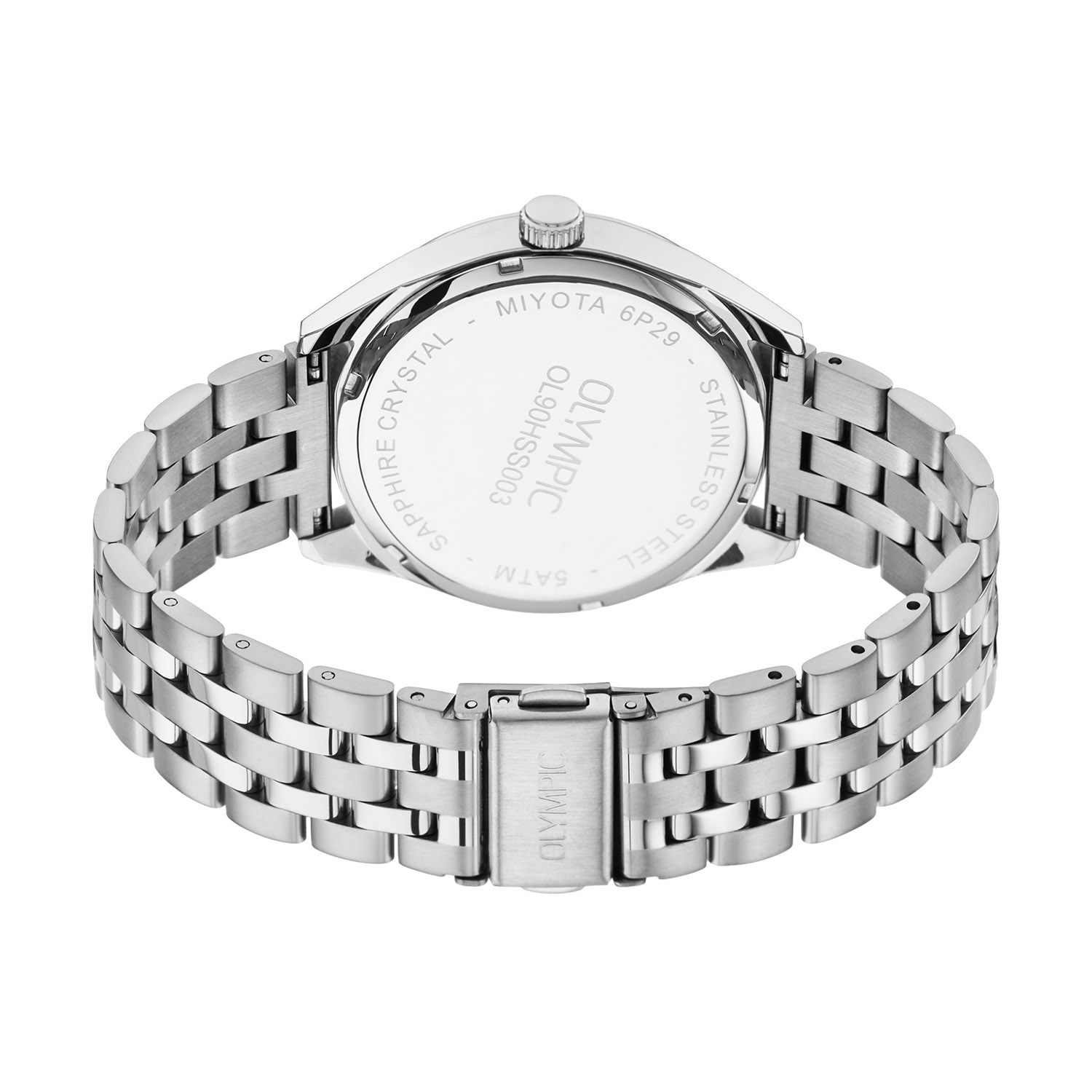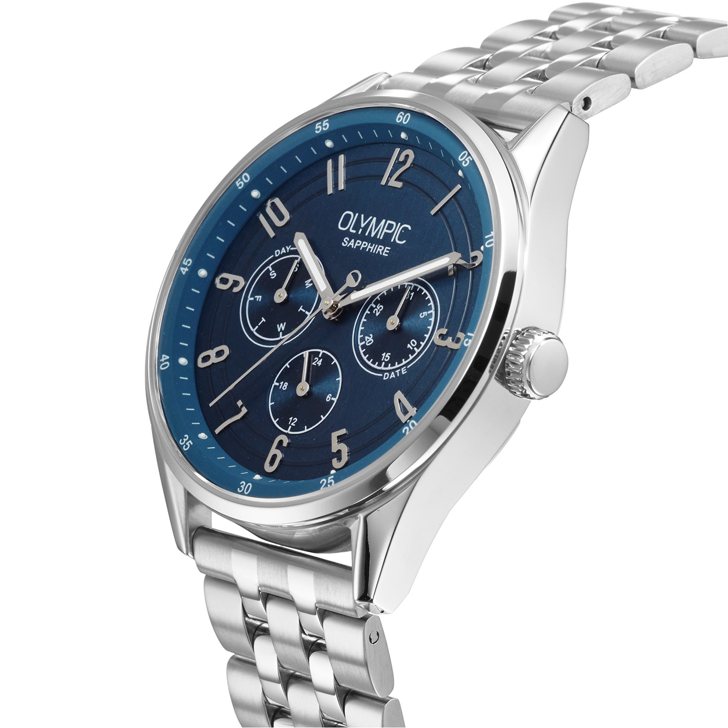 Het Olympic Herenhorloge biedt een elegante combinatie van functies: een blauw analoog uurwerk met roestvrijstalen kast en band, beide zilverkleurig. De kastdiameter is 40 mm met een bandbreedte van 20 mm. Dit horloge heeft saffierglas, een waterdichtheid van 5 ATM en een datumaanduiding. Ideaal voor dagelijks gebruik en formele gelegenheden.