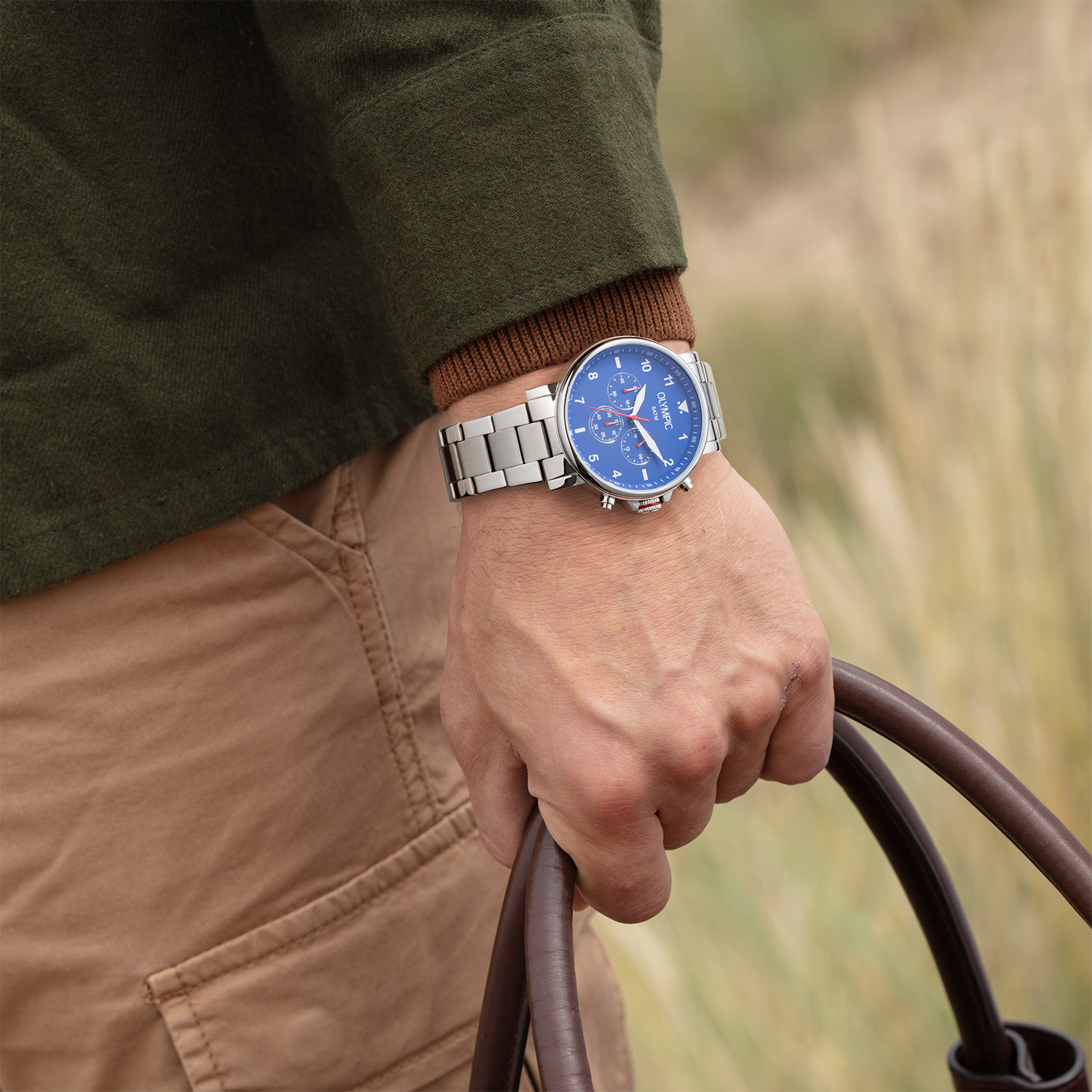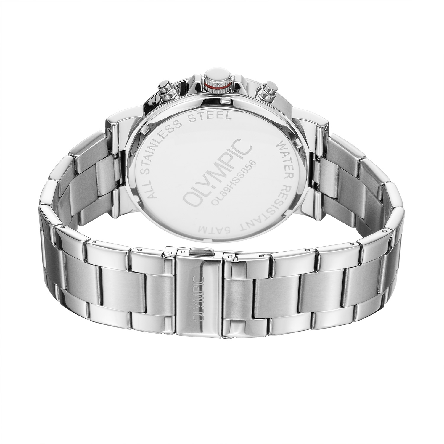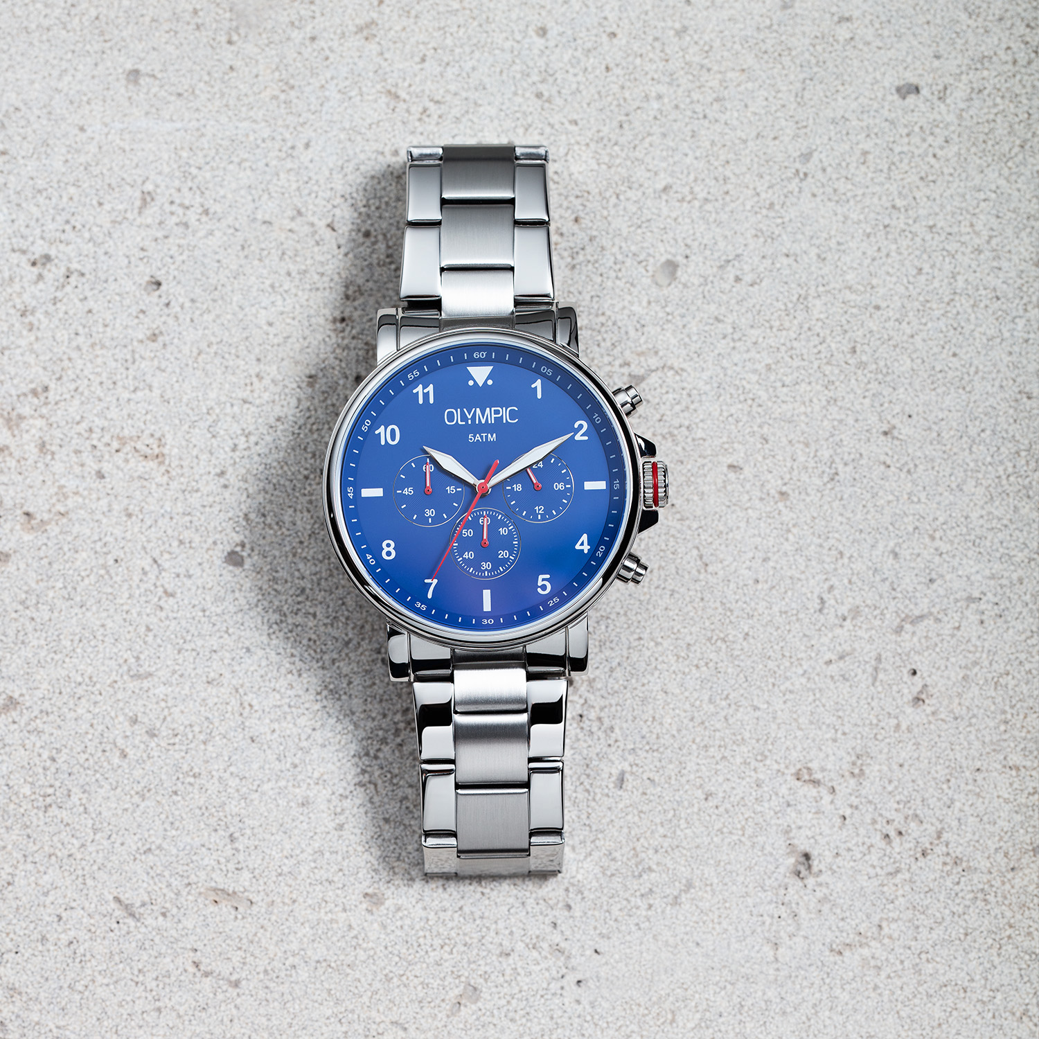 Dit unieke Olympic horloge is een herenhorloge met chronograaf en heeft een sportieve uitstraling. De stalen kast heeft een blauwe wijzerplaat met een chronograaf. De uursaanduiding is opvallend door de Arabische cijfers en wijzers. De rode accenten geven het horloge een sportief uiterlijk. Aan de stalen kast zit een stalen schakelband met een vouwsluiting. Het horloge heeft een mineraalglas, een doorsnee van 44mm en is 10ATM.