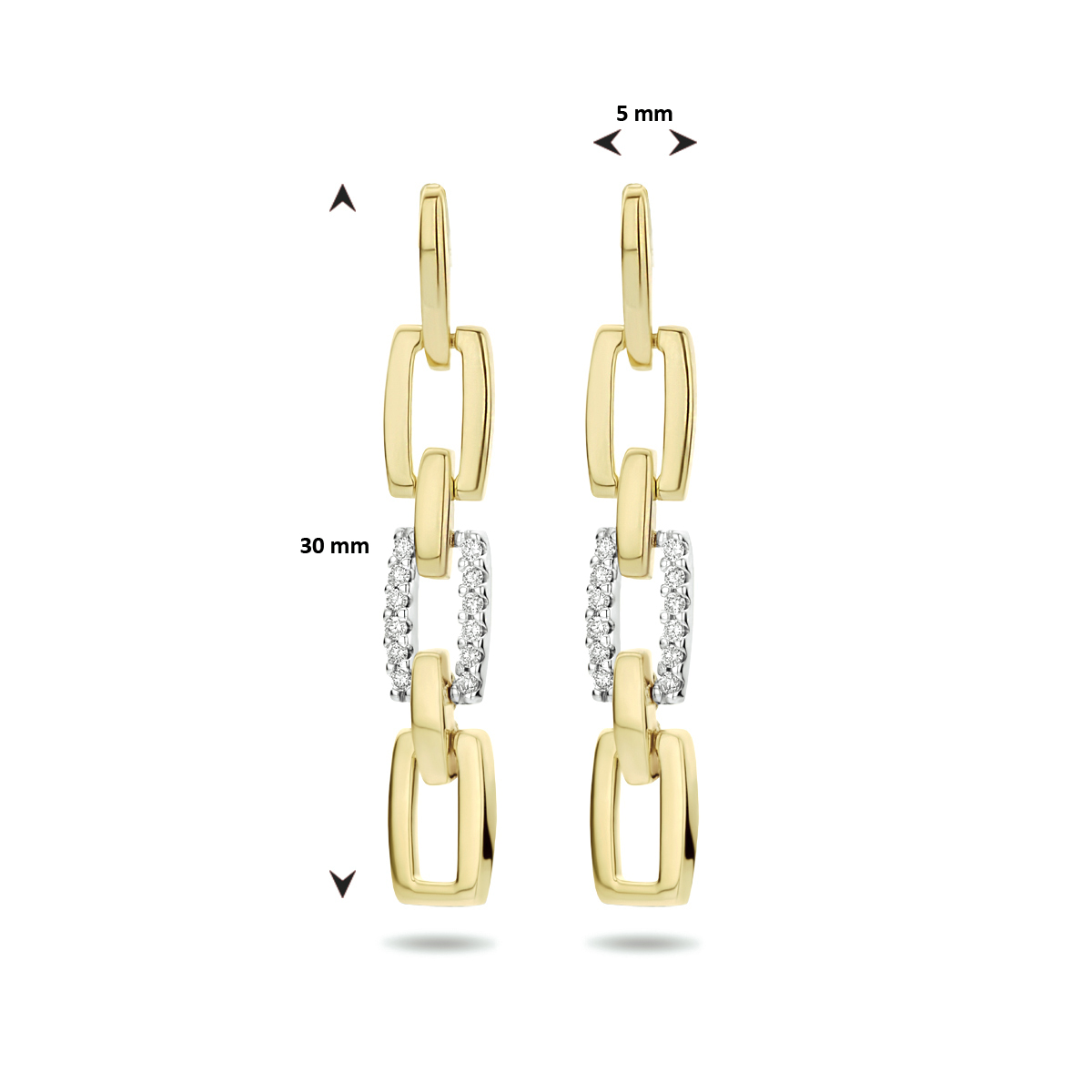 14k Bicolor geel- en witgouden oorhangers uitgevoerd met een schitterende diamant rij. De oorhangers hebben een afmeting van 30x5mm.