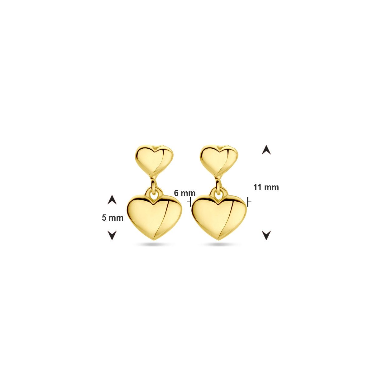 14k Geelgouden oorhangers uitgevoerd met twee harten. De oorhangers hebben een totale hoogte van 11mm.