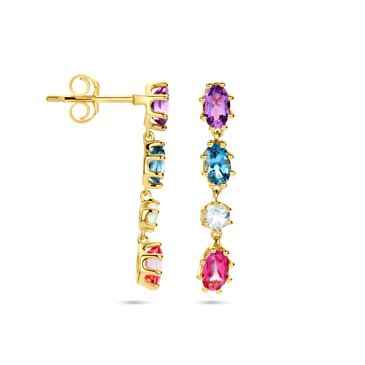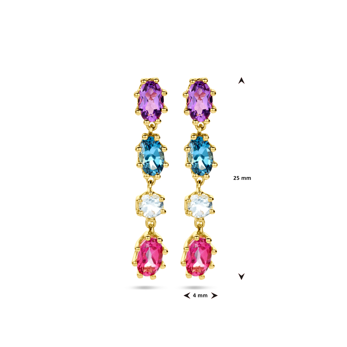 14k Geelgouden oorhangers uitgevoerd met amethist, London blue topaas, sky blue topaas en roze topaas. De oorhangers hebben een totale hoogte van 25mm.