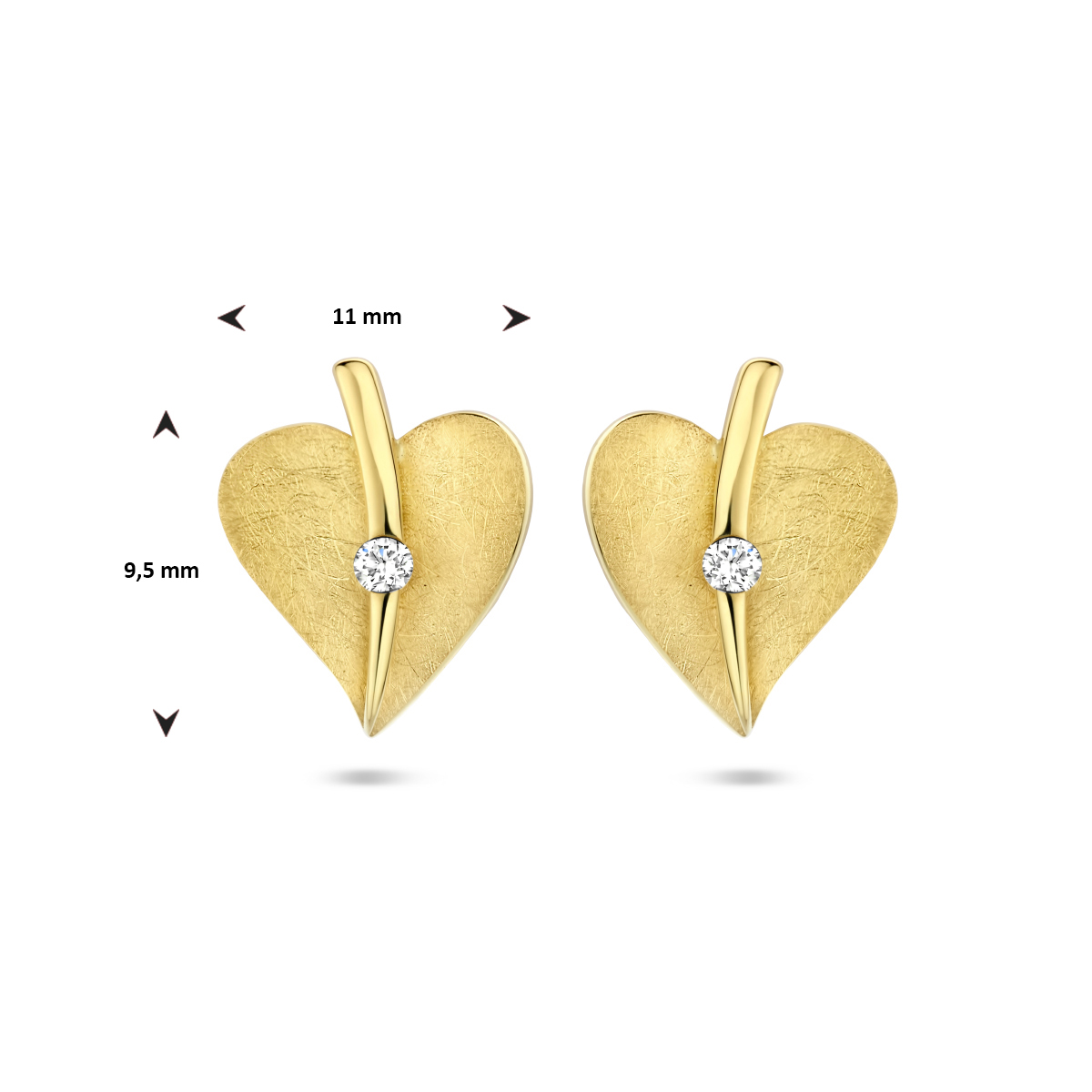 14k Geelgouden oorknoppen uitgevoerd in vorm van een hart en een schitterende diamant. De oorknoppen hebben een afmeting 11x9.5mm.