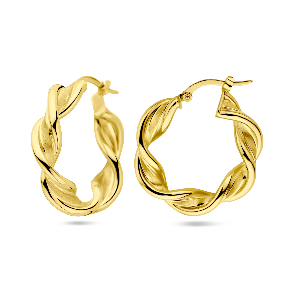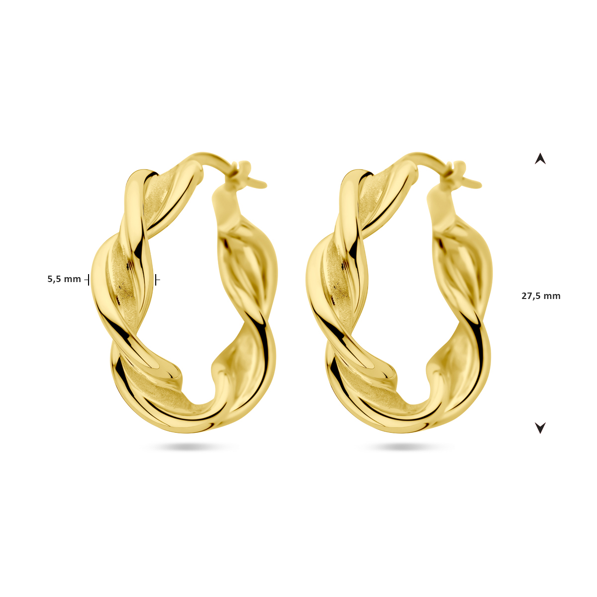 Deze prachtige gouden oorringen van het huismerk zijn gedraaid, wat zorgt voor een unieke en stijlvolle uitstraling. De oorringen zijn van hoge kwaliteit en perfect voor dagelijks gebruik of een speciale gelegenheid. Draag ze met je haar opgestoken voor een elegante look, of laat ze opvallen met een simpele outfit. Een tijdloos en veelzijdig sieraad voor elke vrouw.