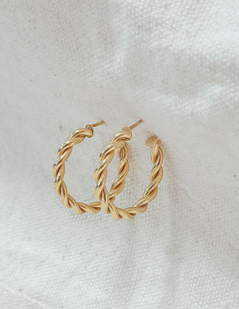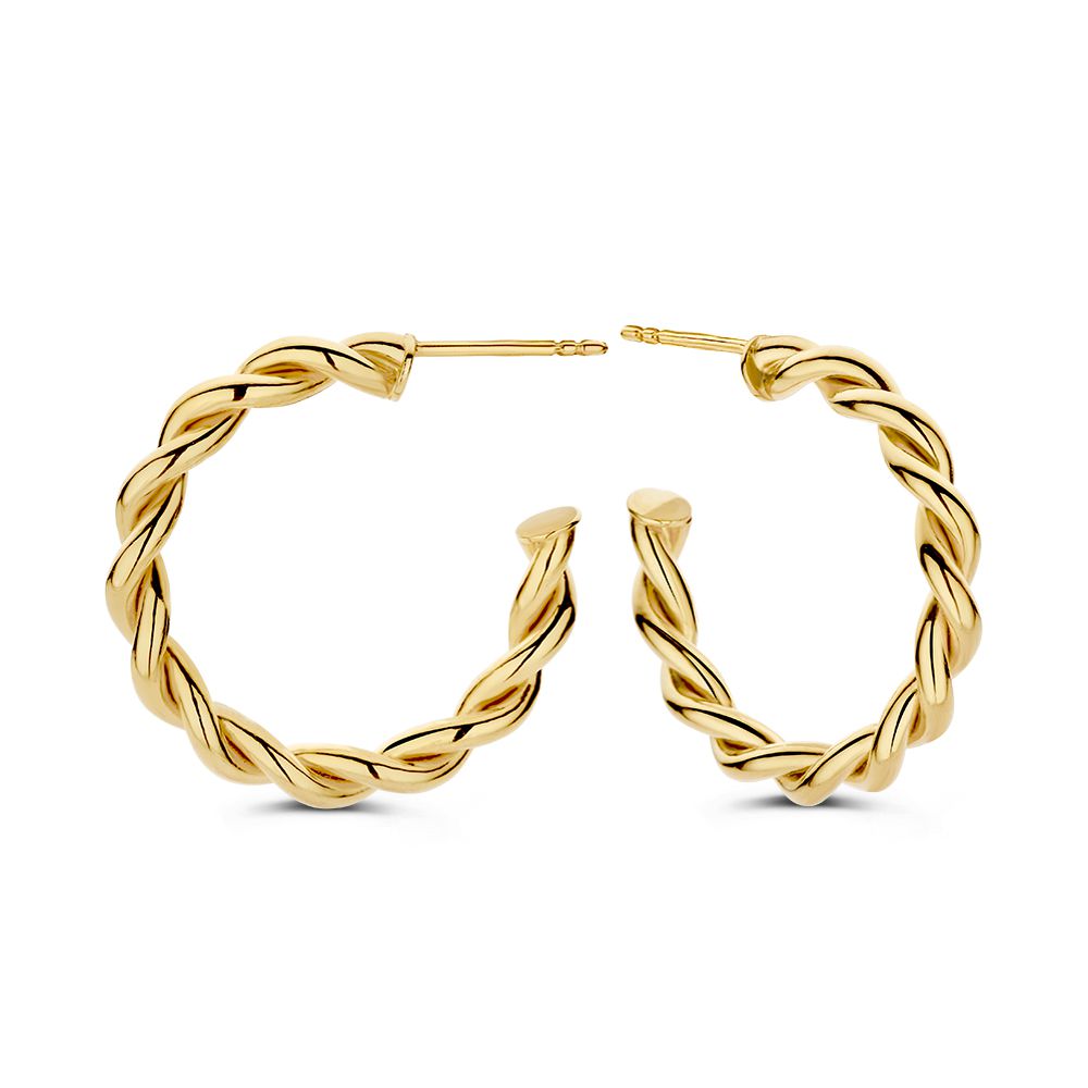 Geelgouden oorringen met gedraaide band. De oorbellen worden geleverd met 14kt gouden poussettes.
