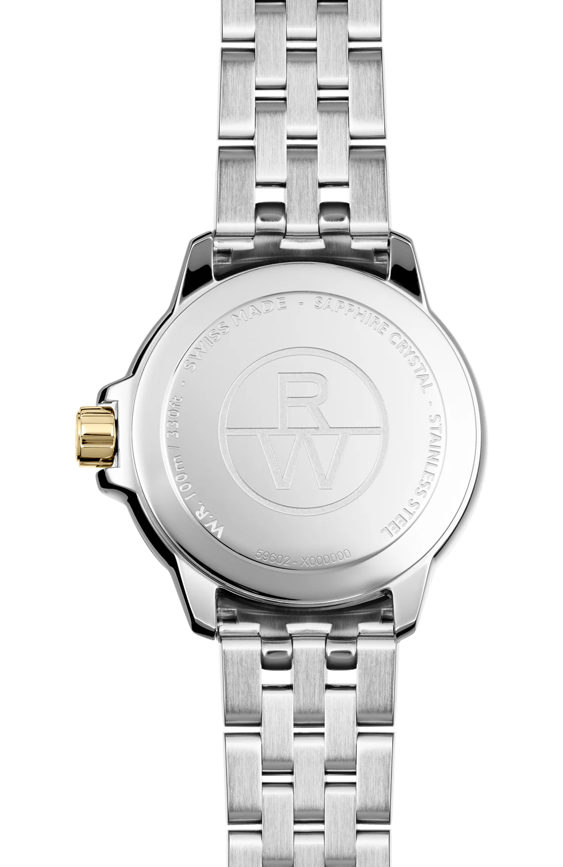 De RAYMOND WEIL dameshorloge, model 5960-STP-30041, combineert elegantie met functionaliteit. Kenmerken: saffierglas, 10 ATM waterdicht, witte wijzerplaat, ronde kast, goud-zilver roestvrijstalen band en quartz beweging. Perfect als stijlvol polshorloge. Draag het voor formele gelegenheden of alledaagse luxe. Deze klassieke tijdmeter straalt verfijning uit. Bestel nu en voeg klasse toe aan je collectie.