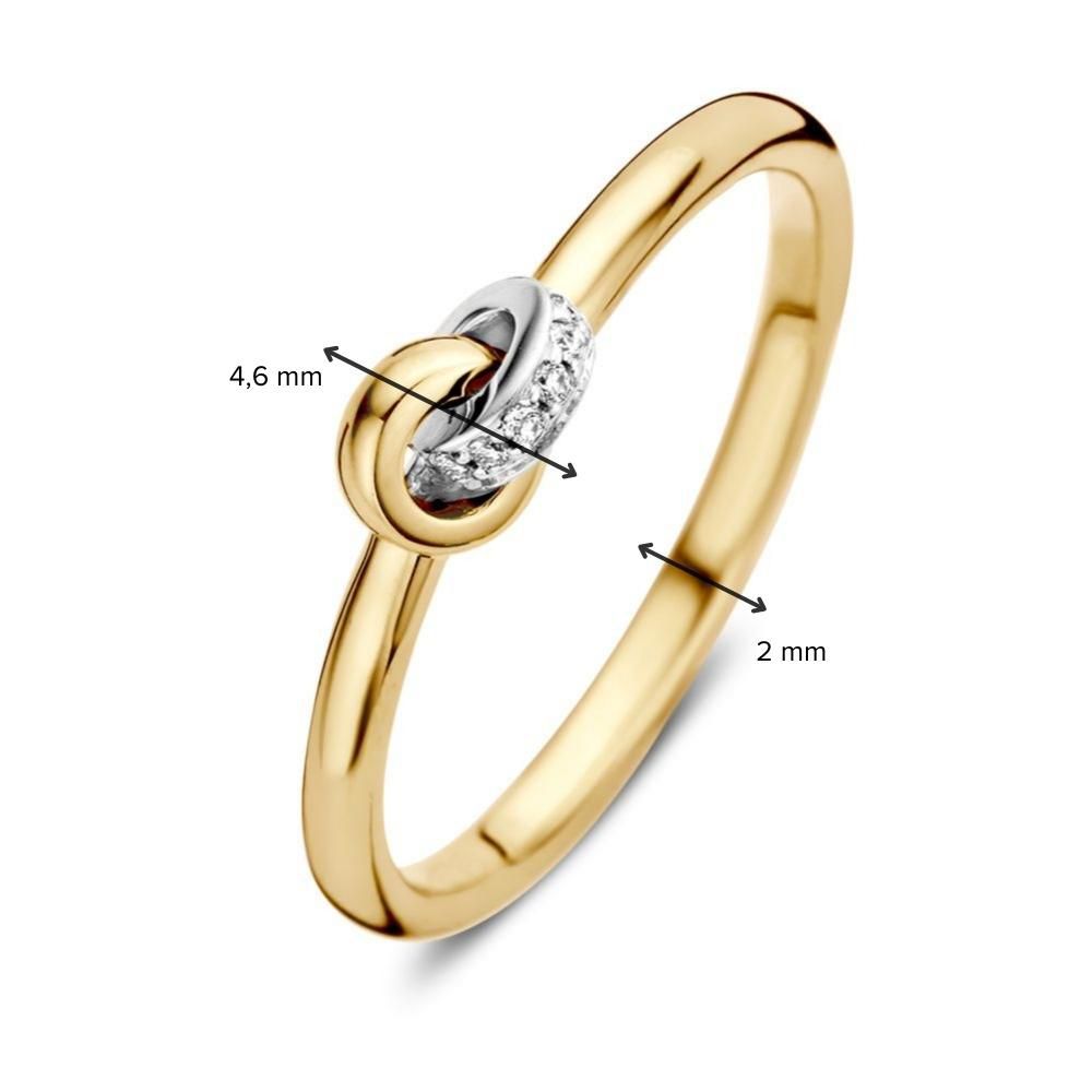 Bicolor geel- en witgouden ring met een knoopje gezet met briljant. Deze ring kan naadloos tegen andere ringen aangedragen.