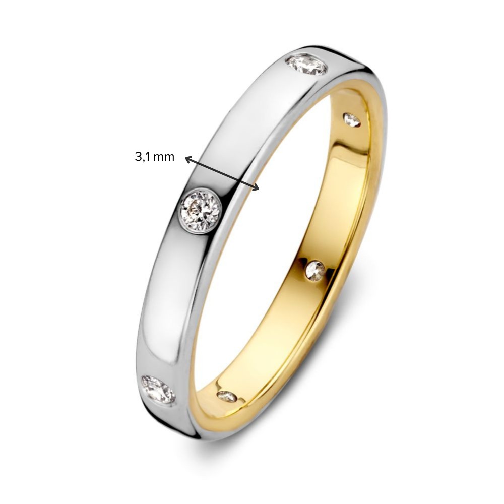 Bicolor wit- en geelgouden ring met diamant. Deze ring is gemaakt van twee ringen (een binnenste geelgouden en buitenste witgouden ring), welke perfect en volledig naadloos in elkaar overgaan.�De ring is rondom gezet met 6 briljanten, die glad in de ring liggen. Een perfecte trouwring of stijlvolle aanschuifring!