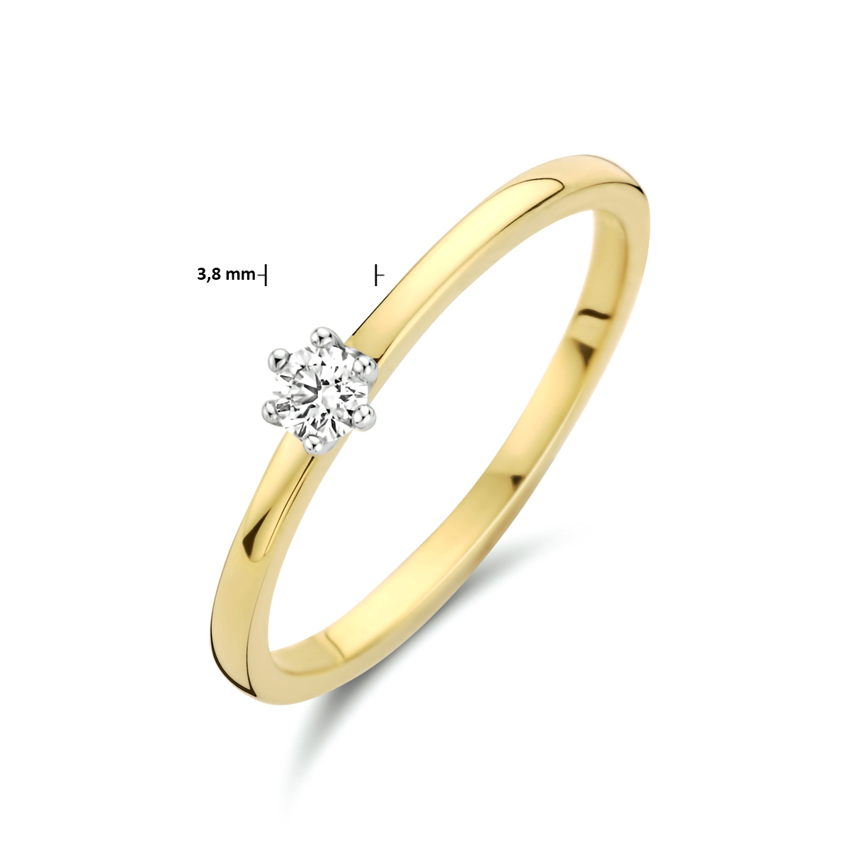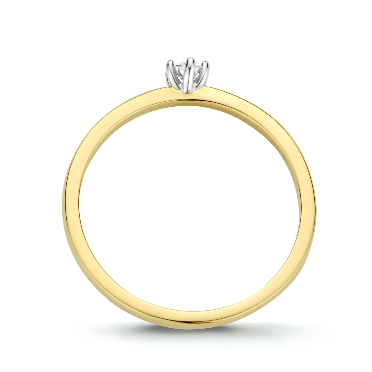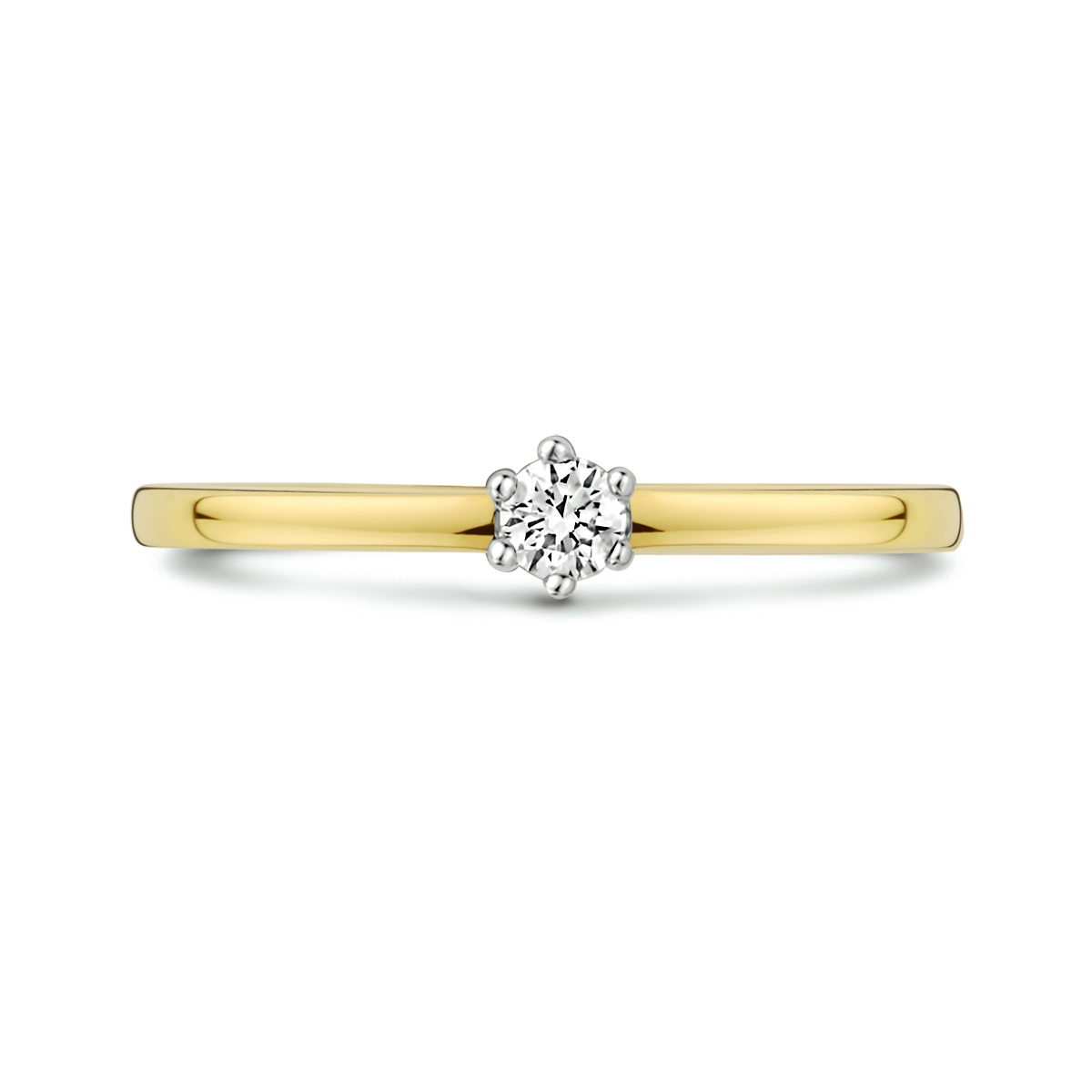 14k Bicolor geel- en witgouden ring uitgevoerd met een schitterende diamant. De ring heeft een breedte van 3.8mm.