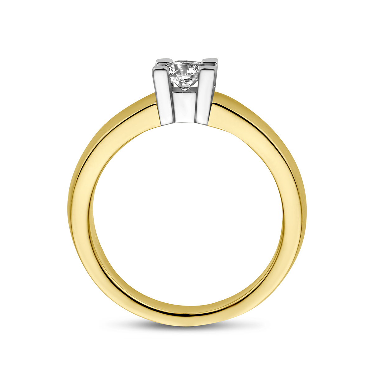 Prachtige 14 karaat gouden ring met een strakke solitair brede band en opvallende vierpootszetting.