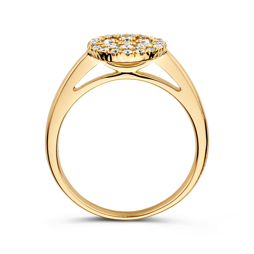 Prachtige gouden ring met diamanten in een dubbele halo zetting. Tevens kun je deze ring aanschuiven tegen een andere ring.