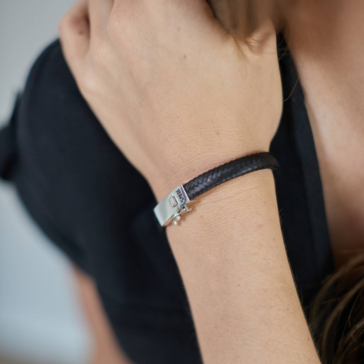 Deze handgevlochten leren armband van zacht lamsleer sluit middels een strak massief zilveren bakslot. Door het zachte soepele leer valt de armband lekker om de pols en draagt daardoor prettig. De sluiting van dit slot geeft de mogelijkheid om een naam, geboortedatum, initialen, sterrenbeeld of een symbool te graveren. Combineer een leren armband ook eens met een zilveren armband om je look compleet af te stylen. Alle SILK sieraden worden geleverd in een mooie luxe geschenkverpakking.