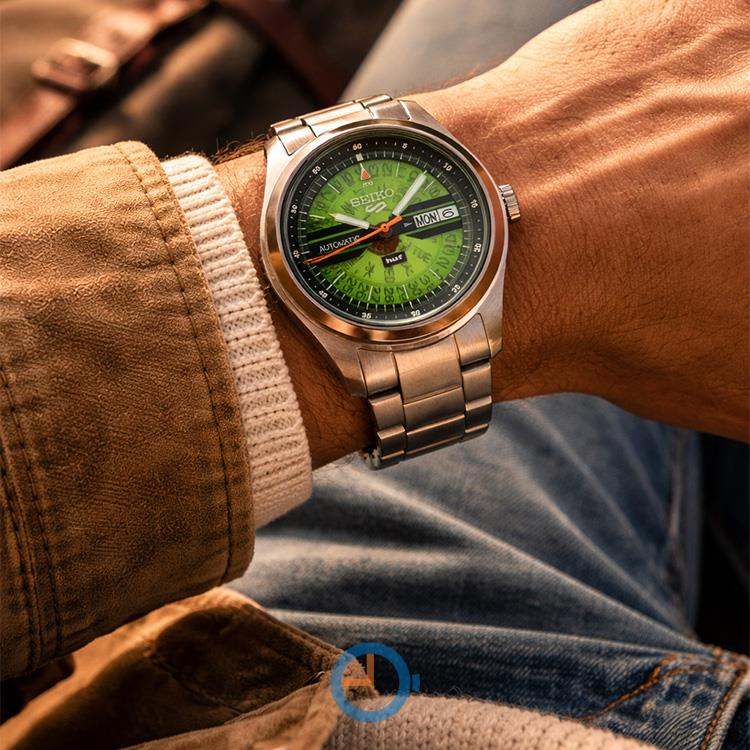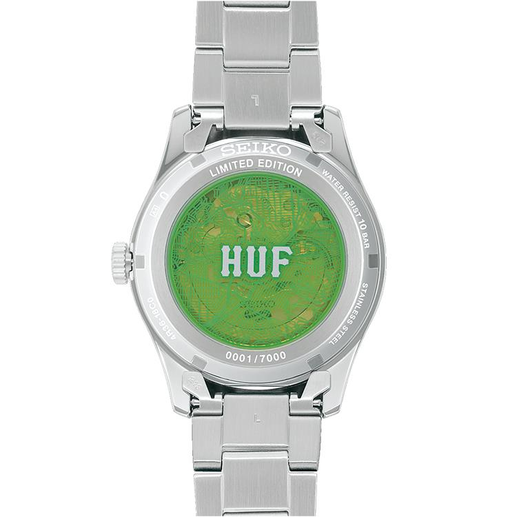 Dit opvallende herenhorloge van Seiko (model SRPM09K1) uit de Seiko 5 Sports collectie is een bijzondere limited edition in samenwerking met streetwearmerk HUF. Het horloge heeft een 39,4 mm roestvrijstalen kast, een semi-transparante groene wijzerplaat met HUF-logo en lichtgevende wijzers en indexen voor optimale afleesbaarheid. Binnenin werkt het automatische Seiko 4R36 uurwerk met 24 jewels en een gangreserve van circa 41 uur. Het horloge beschikt over Hardlex glas, een dag- en datumweergave en is waterdicht tot 100 meter. De transparante kastdeksel met speciaal ontwerp en serienummer benadrukt het exclusieve karakter van deze gelimiteerde uitgave.