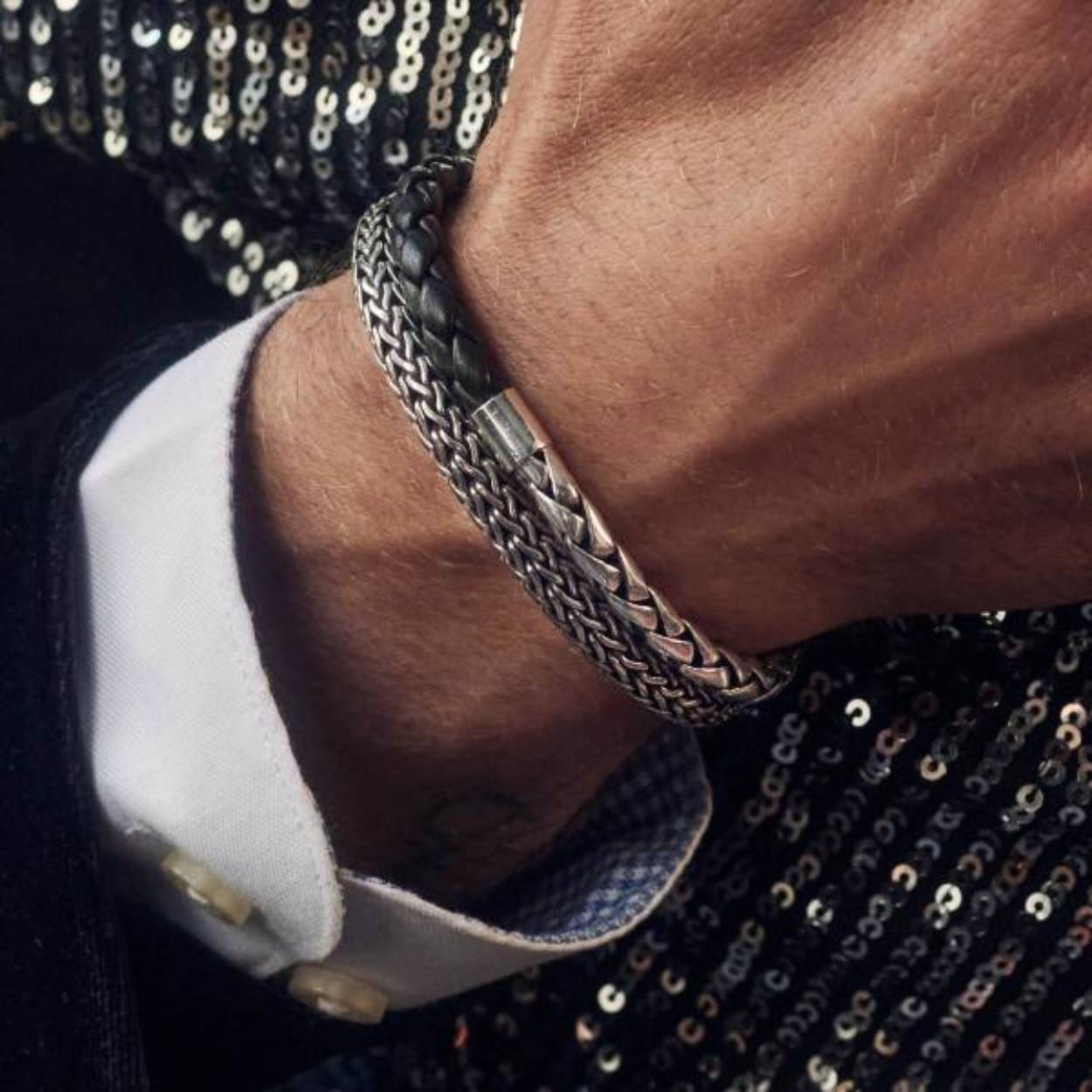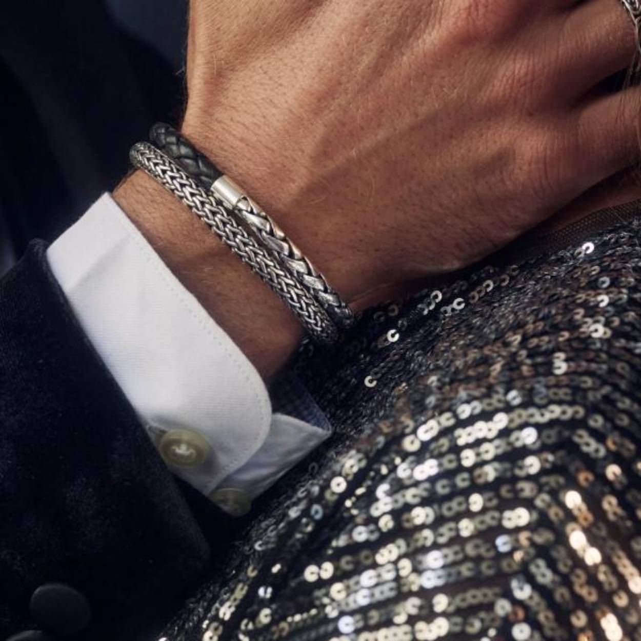 Ontdek de stoere uitstraling van deze ronde armband, vakkundig vervaardigd uit sterling zilver en hoogwaardig gevlochten lamsleer. Het unieke ontwerp combineert een ronde vlechtstructuur met een zwarte gevlochten lederen armband, waardoor het een veelzijdige keuze is voor zowel dames als heren. Mix en match deze armband met andere handgemaakte sterling zilveren banden om je eigen speelse look te creëren. Verpakt in een luxe geschenkverpakking, is deze armband niet alleen een stijlvolle toevoeging aan je collectie, maar ook een prachtig cadeau voor speciale gelegenheden.