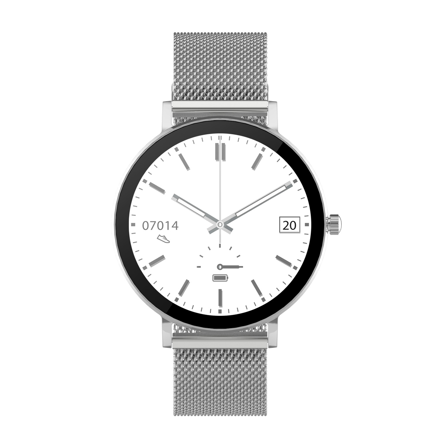 Dit Smarty Smartwatch horloge met nr: SW079B is een stap in de toekomst. De zilverkleurige ronde kast is gemaakt van metaal met een gehard glas. Aan de kast zit een zilverkleurige milanese band met een druksluiting. Het ronde horloge heeft een afmeting van 41mm en is spatwaterdicht. Dit dames model heeft een platte kast van 7,5mm . Deze smartwatch is sportief, stijlvol, maar zeker gebruiksvriendelijk. Om door apps, berichten en tekst te bladeren hoeft je alleen maar op het glas te tikken of de knop te gebruiken.