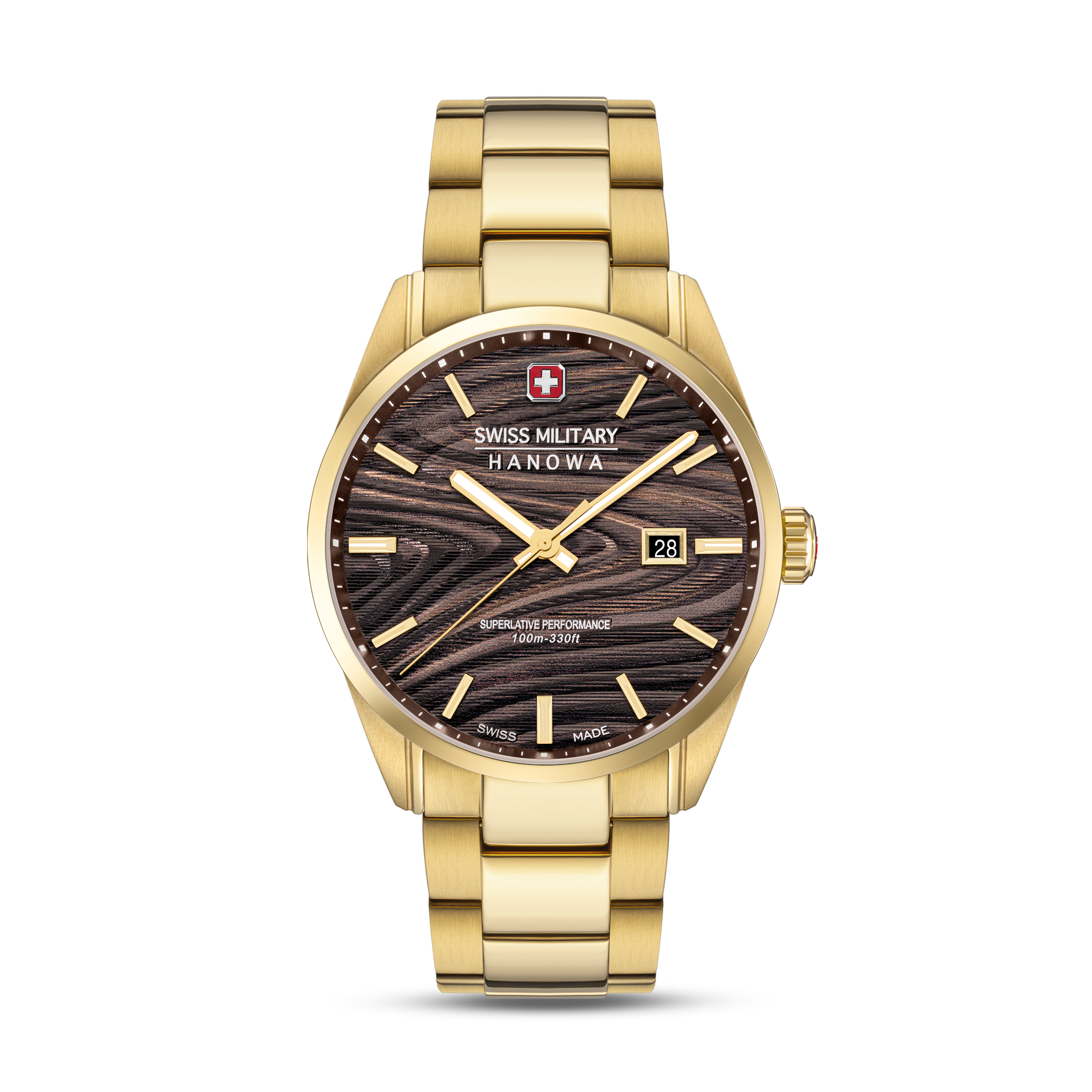Dit Swiss Military Hanowa herenhorloge (model SMWGH0006010) heeft een zwarte wijzerplaat met strepenpatroon, gouden roestvrijstalen kast en band, en saffierglas. Het horloge is rond, 42 mm groot, beschikt over een quartz uurwerk en datumaanduiding, en is waterbestendig tot 10 ATM. Perfect te dragen bij zowel formele als casual outfits voor een stijlvolle look.