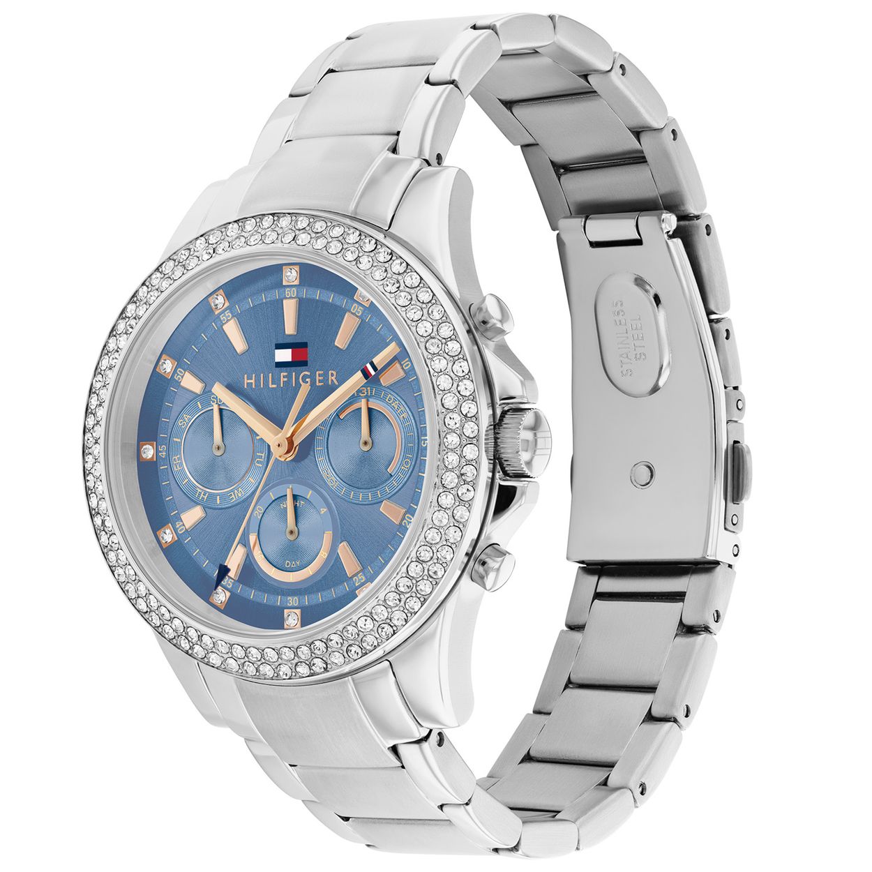 Dit specifieke horloge van Tommy Hilfiger uit de Haven Le serie met artikelnr: TH1782690 is een sportief chic dameshorloge die zeker in je collectie past. Het stalen dameshorloge heeft een ronde zilverkleurige kast met een bezel met 2 rijen zirkonia's en een blauwe wijzerplaat met dag,- datum en 24-uursaanduiding en rosékleurige wijzers en accenten. De zilverkleurige schakelband is op lengte verstelbaar en heeft een vouwsluiting. Het horloge heeft een mineraalglas, een doorsnee van 38mm en is 3ATM.