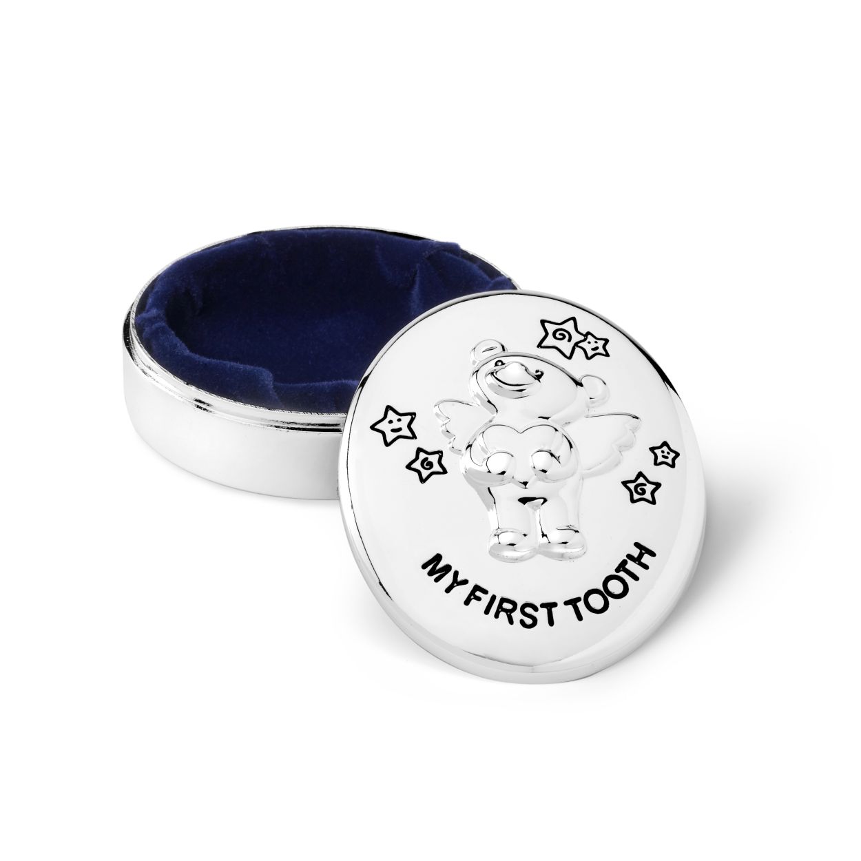 Ovalen tandendoosje met de afbeelding van een beertje en sterretjes en de inscriptie 'My first tooth'. Blauw velours binnenzijde. Dit doosje kan gegraveerd worden, wat het een persoonlijk geschenk maakt en is verzilverd en gelakt, waardoor poetsen overbodig is.