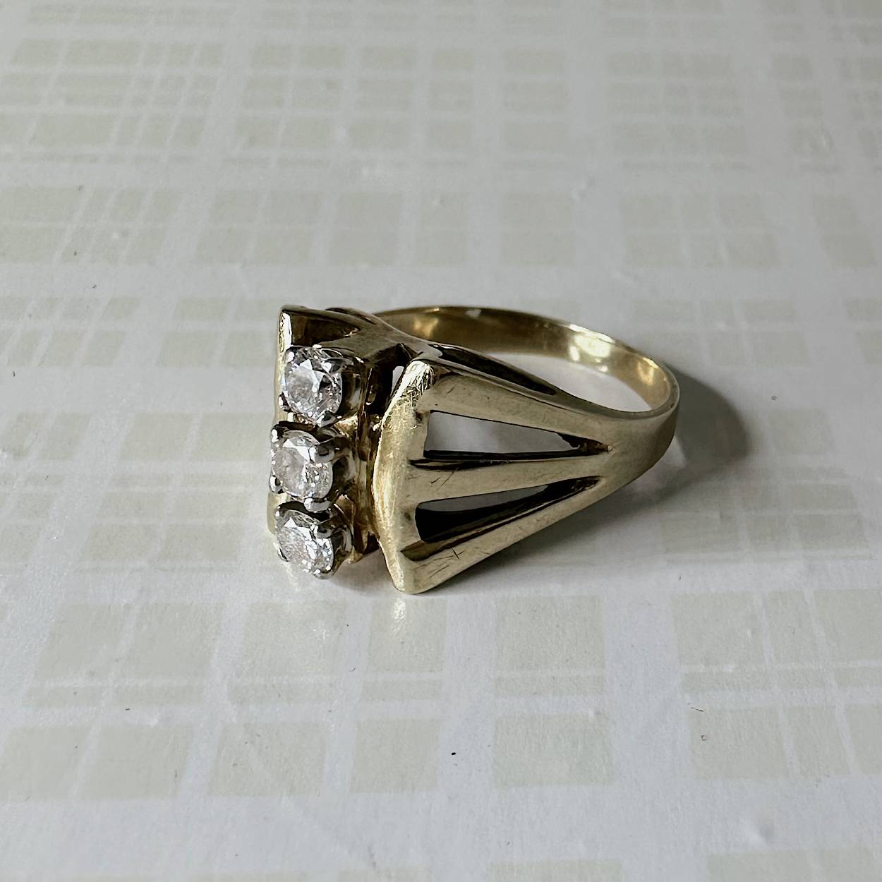 Deze prachtige vintage gouden ring is uitgevoerd met drie prachtige diamanten in een briljante slijpvorm. De ring is beschikbaar op maat 53.