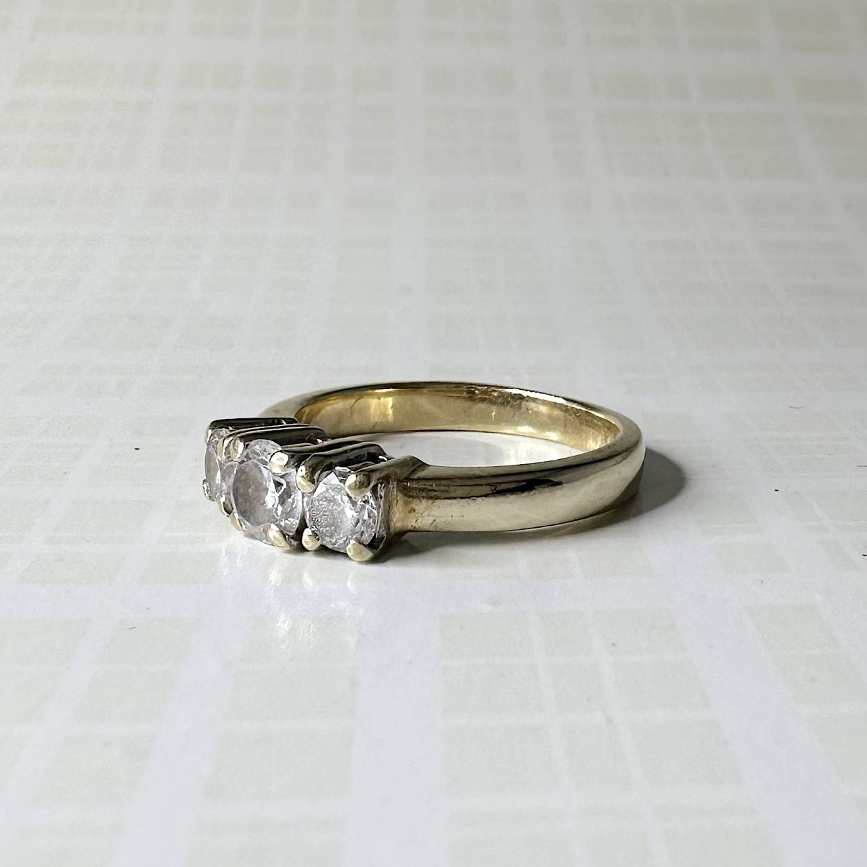 Deze prachtige vintage, gouden ring is uitgevoerd met drie sprankelende zirkonia met briljant als slijpvorm. De ring is beschikbaar op de maat 55