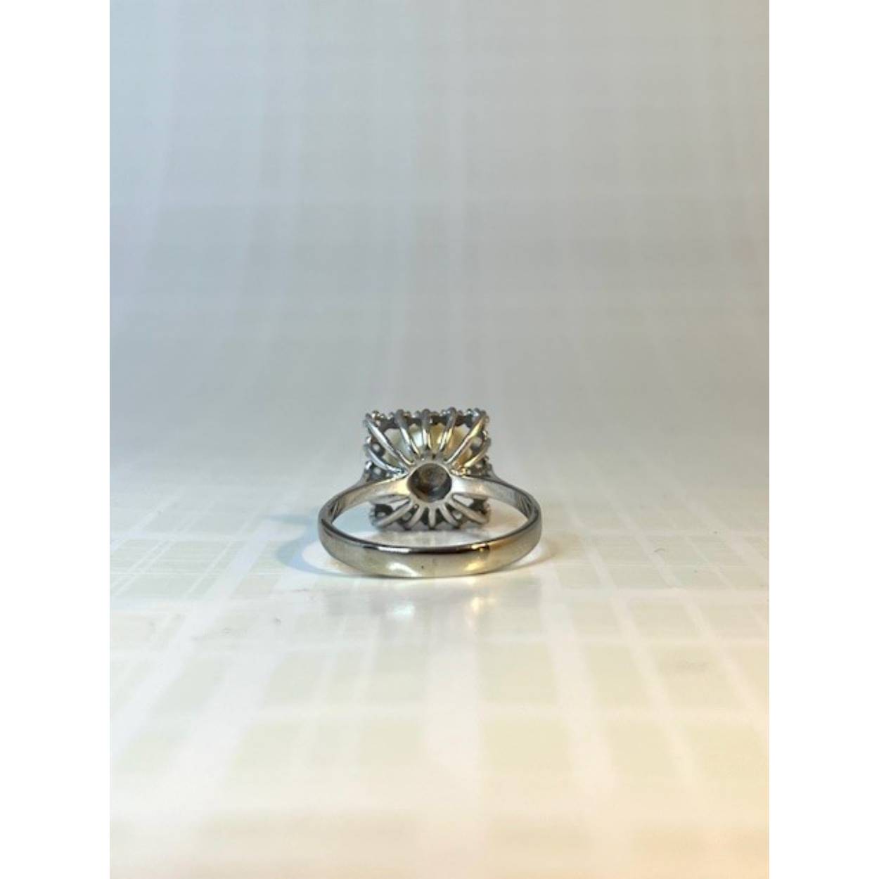 Deze prachtige vintagering is gemaakt van witgoud met een legering van 18 karaat. De ring heeft een parel met daaromheen zirkonia.
